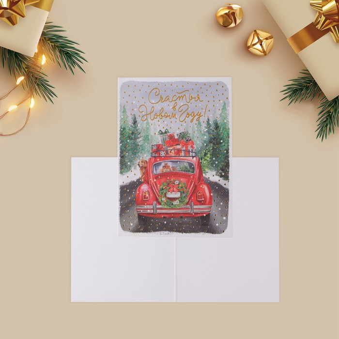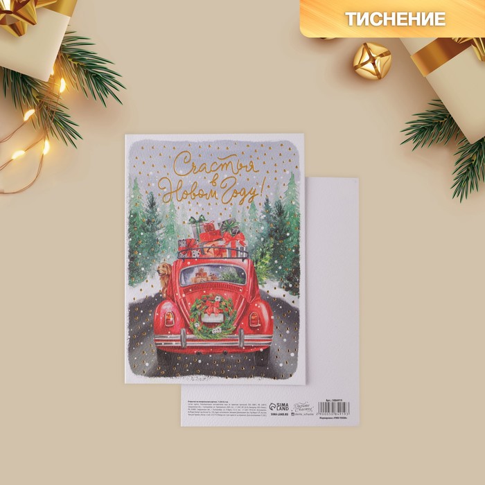 Открытка с новым годом на акварельном картоне «Машина с подарками», тиснение, 11,8 х 16,4 см — Характеристики