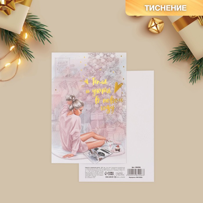 Открытка с новым годом на акварельном картоне «Тепла и уюта», тиснение, 10 х 15 см — Характеристики