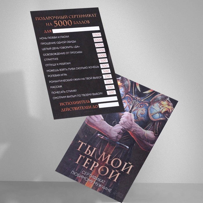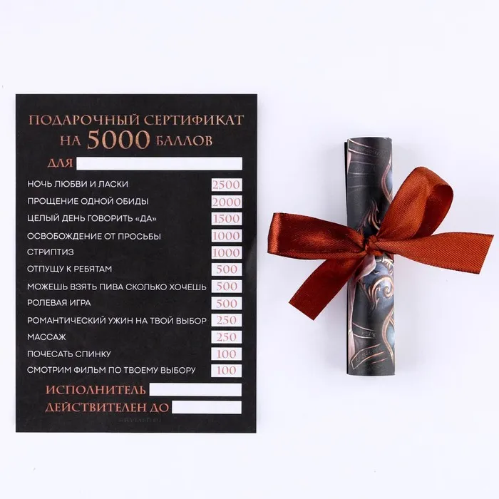 Обладатель сертификата сможет в любое время загадать любое желание из 12, а даритель обязан его исполнить. Каждое из желаний имеет разную стоимость в баллах, а общая сумма баллов в сертификате 5000.