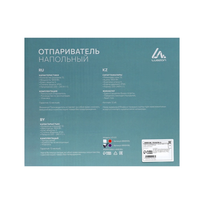 Отпариватель Luazon LO-07, напольный, 1800 Вт, 1.4 л, 46 г/мин., 12 режимов, фиолетовый — Характеристики