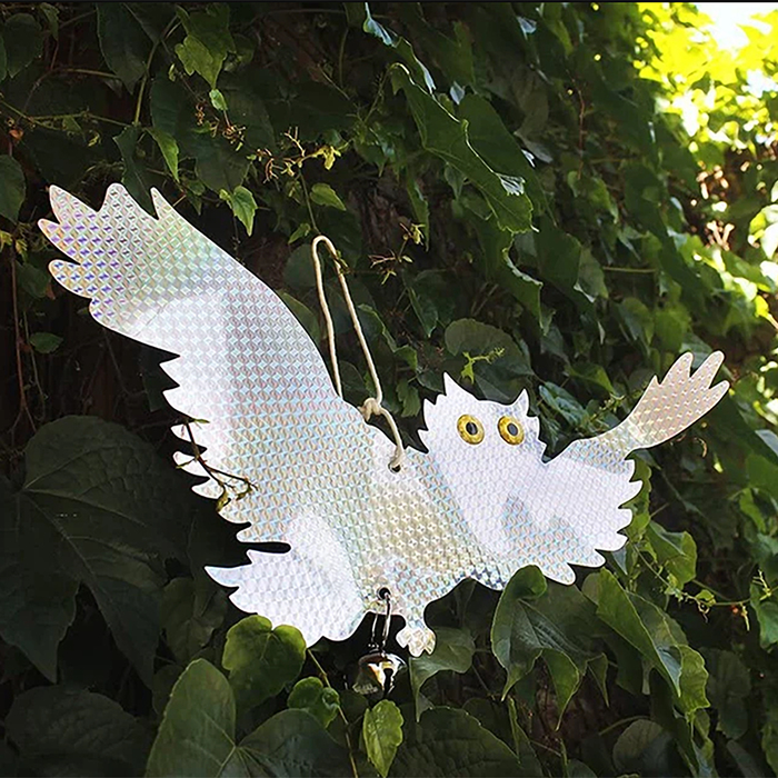 - Тройной отпугивающий эффект: силуэт совы имитирует природного врага, блестящая поверхность создаёт неожиданные блики на солнце, а колокольчик издает тихий звон на ветру. Это воздействует на птиц одновременно по нескольким каналам восприятия.
