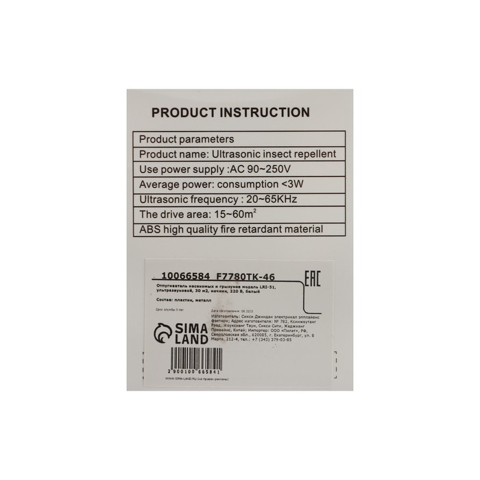Отпугиватель насекомых и грызунов LRI-51, ультразвуковой, 30 м², ночник, 220 В, белый — Характеристики