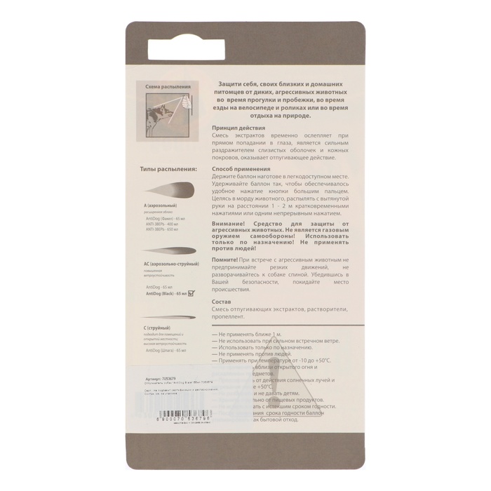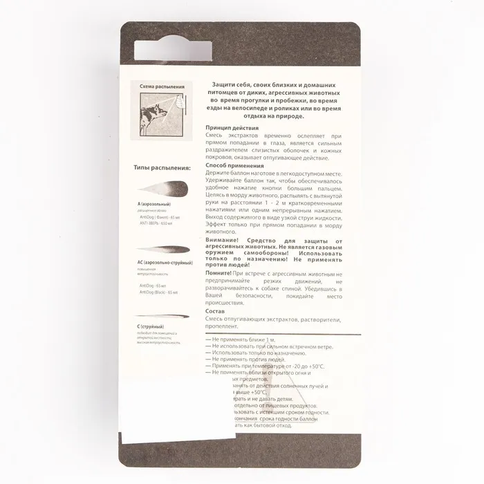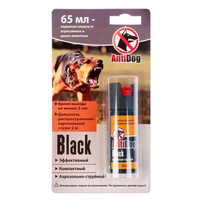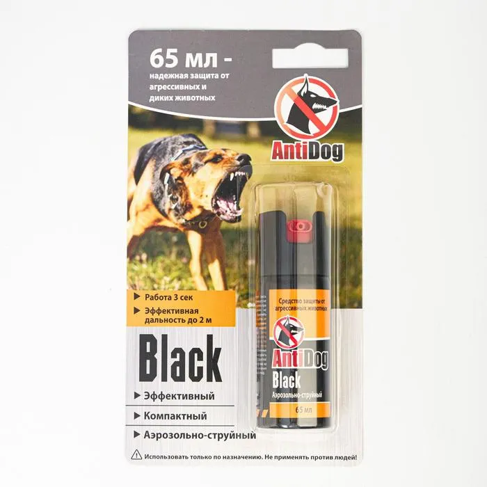 Распылитель (аэрозольный баллончик) AntiDog Black, 65 мл – современное средство самозащиты против агрессивных животных струйно-аэрозольного типа распыления. AntiDog Black разработан специально для использования против стай агрессивных собак и отдельных особей, больных бешенством. В состав баллончика входит смесь отпугивающих экстрактов, репеллент и органические растворители. За счет отсутствия в составе смеси простых ирритантов животное не становится непредсказуемым. При своей высокой эффективности распылитесь AntiDog Black относится к гуманным средствам самообороны, и не наносит животным увечий. Особенность данного распылителя – повышенная ветроустойчивость и отсутствие необходимости точно прицелиться. Распылитель эффективен на расстоянии от 2-х до 3-х метров. В соответствии с российским законодательством запрещено применять данный распылитель против людей, это допустимо только в крайних случаях, в рамках необходимой самообороны. Для защиты от нападения животного необходимо навести баллончик в направлении нападающей стороны и нажать до упора кнопку распылителя. Длительность нажатия – 0,5-3 секунды. Баллончик компактен, удобен для удержания в руке и подходит для ношения в дамской сумочке.