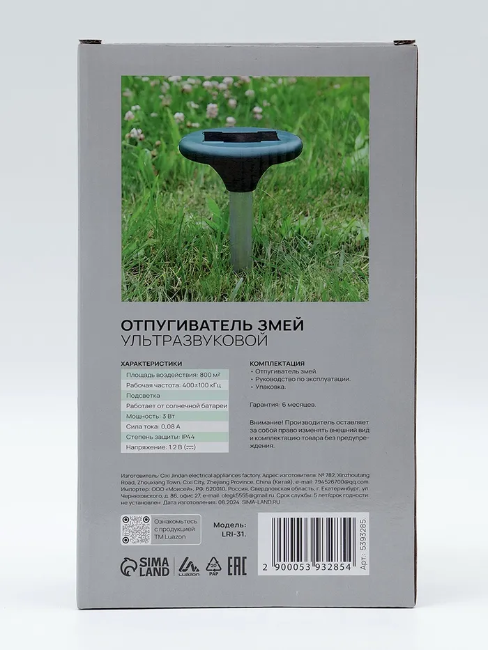 Отпугиватель змей LuazON LRI-31 издаёт высокоинтенсивные звуковые волны, которые находятся за пределами слышимости человека и большинства домашних животных. Площадь воздействия: 800 квадратных метров. Работает от солнечной батареи.