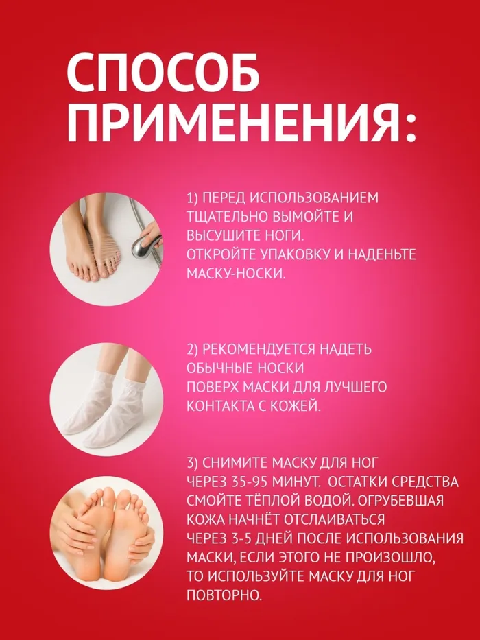 После применения отшелушивающей маски рекомендуется регулярно использовать «Восстанавливающую маску - носки для ног или крем для ног».