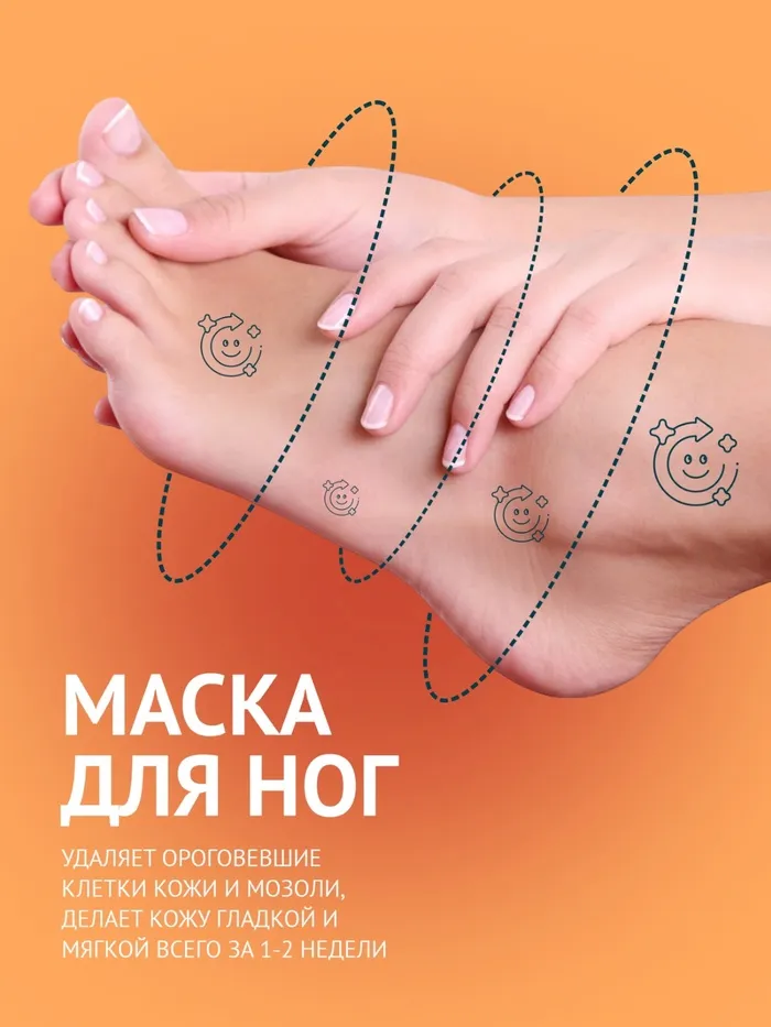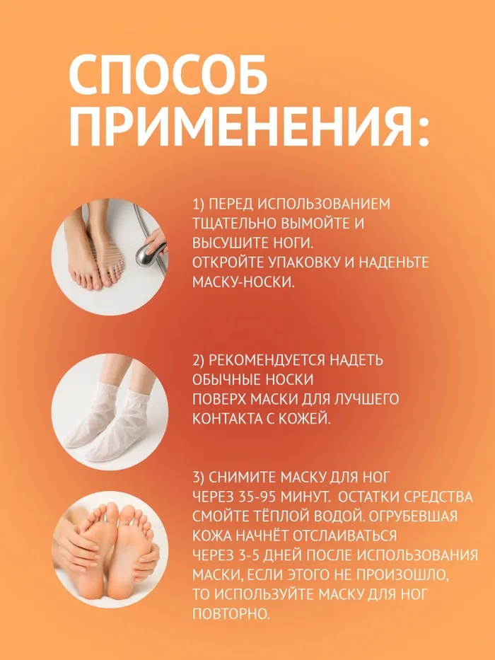 - Перед использованием помойте ноги тёплой водой. Откройте упаковку и наденьте маску-носки.