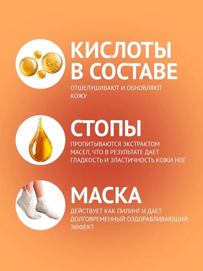Маска отлично удаляет мозоли, натоптыши и огрубевшую кожу стоп, трещины на стопах в течение 2-х недель. Стимулирует обменные процессы, улучшает эластичность и упругость кожи. Регулирует деятельность потовых желёз.