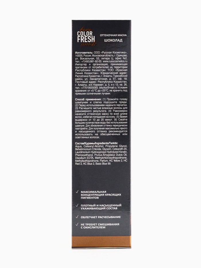 Богатая формула маски насыщает волосы питательными компонентами, укрепляет структуру и возвращает естественную мягкость и сияние, не повреждая и не утяжеляя пряди. Идеальный выбор для тех, кто хочет обновить цвет без стойкой окраски и сохранить здоровье волос.