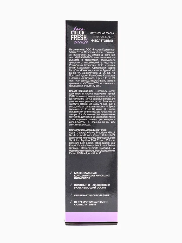 Оттеночная маска для волос FARA Color Fresh "Lilac Snow" — это нежный пепельно-фиолетовый оттенок с холодными лиловыми нотами, который придаёт волосам изысканную глубину и стильный акцент. Маска оживляет цвет, добавляя волосам прохладу и утончённый блеск, идеально подходящий для тех, кто хочет выделиться и подчеркнуть свою индивидуальность.