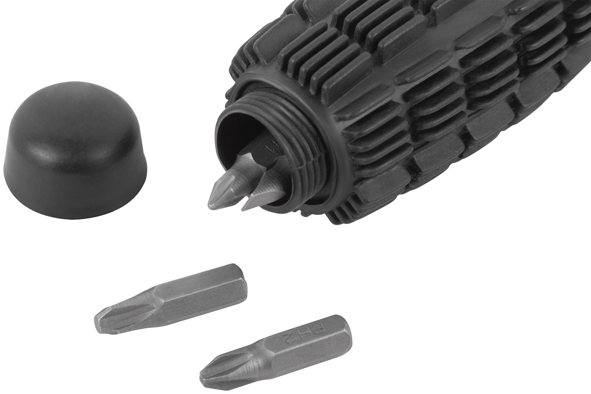 Отвертка оснащена усиленной пластиковой ручкой с резиновой антискользящей накладкой, что обеспечивает надежный хват даже в условиях повышенной влажности. Встроенный отсек для хранения бит позволяет иметь под рукой нужные насадки в любой момент.