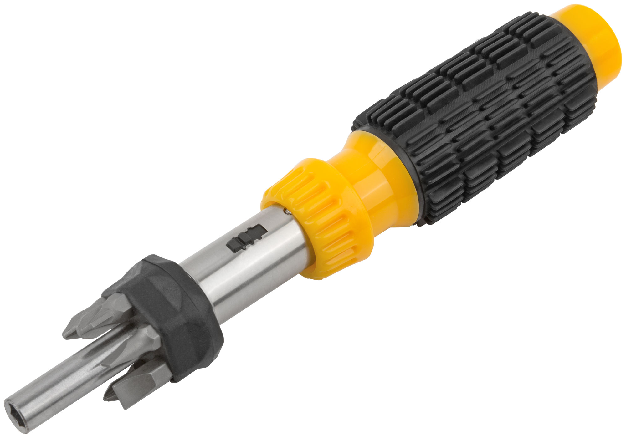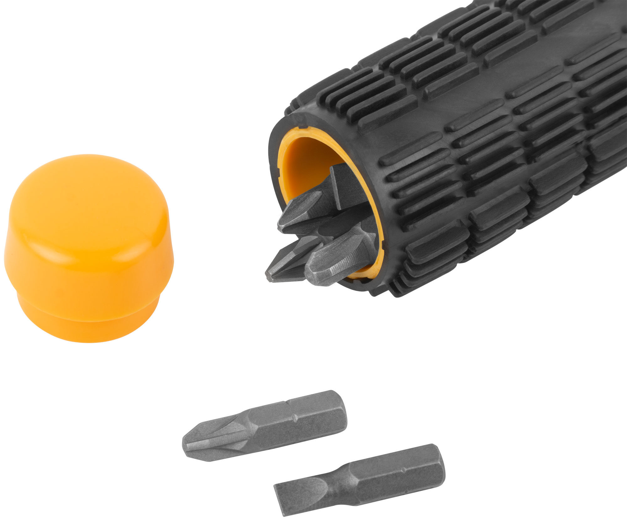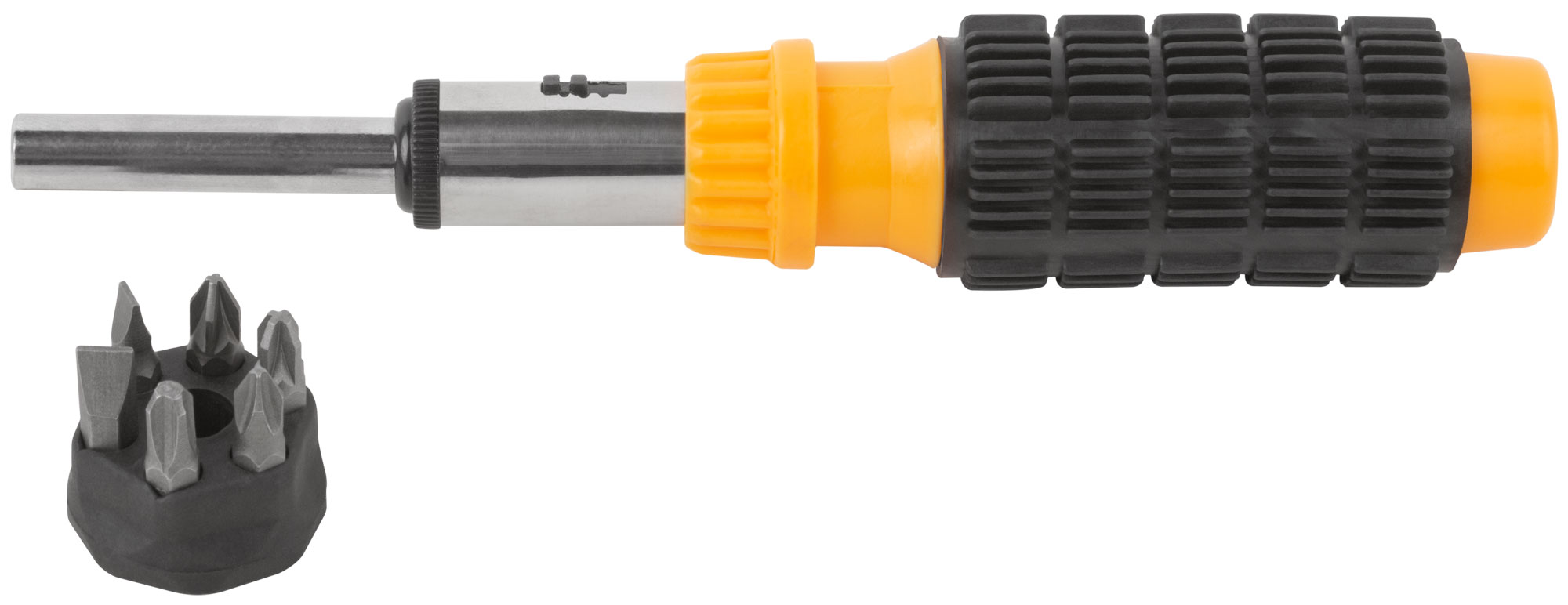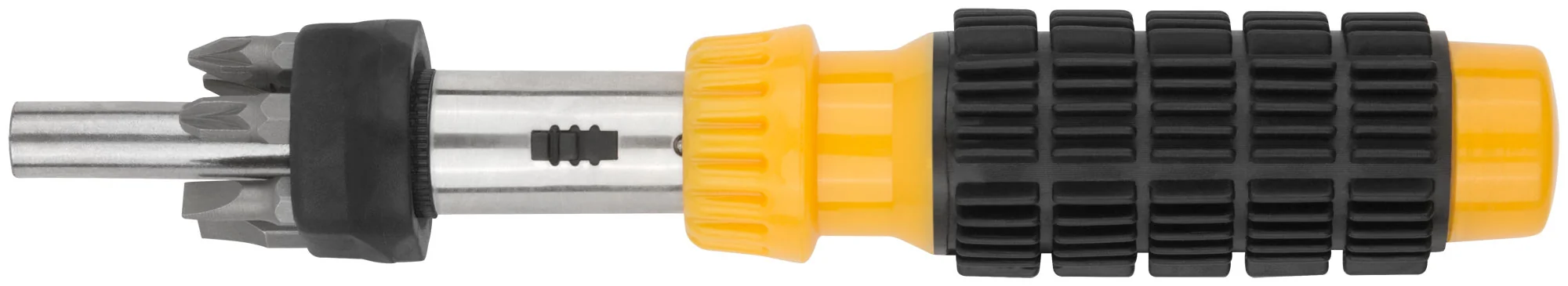 Инструмент оснащён магнитным фиксатором, который надёжно удерживает биты, а пластиковая прорезиненная ручка с отсеком для их хранения обеспечивает удобство и компактность. Хром-ванадиевая сталь бит обеспечивает долговечность и надёжность в работе.