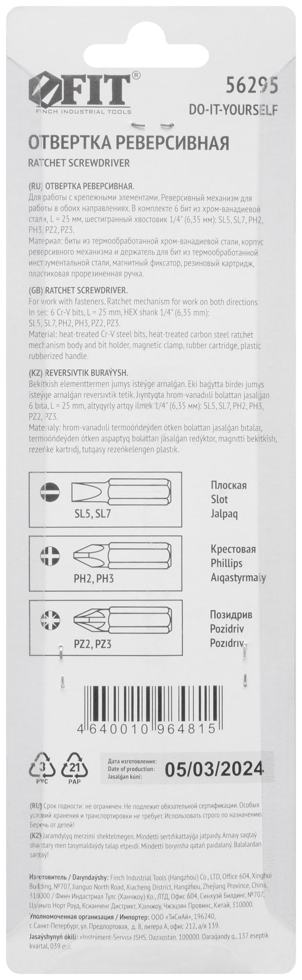 Отвертка реверсивная FIT 56295 подходит для сборки мебели, ремонта бытовой техники или автомобильных работ. Она позволяет быстро менять биты и легко справляться с различными задачами, где требуется надёжная фиксация инструмента.