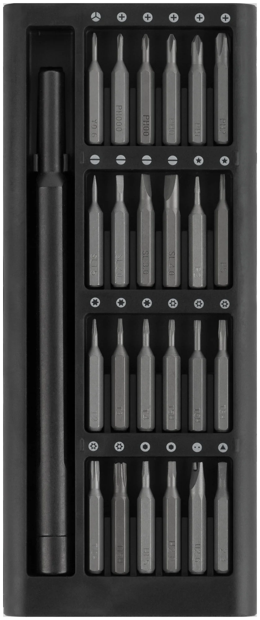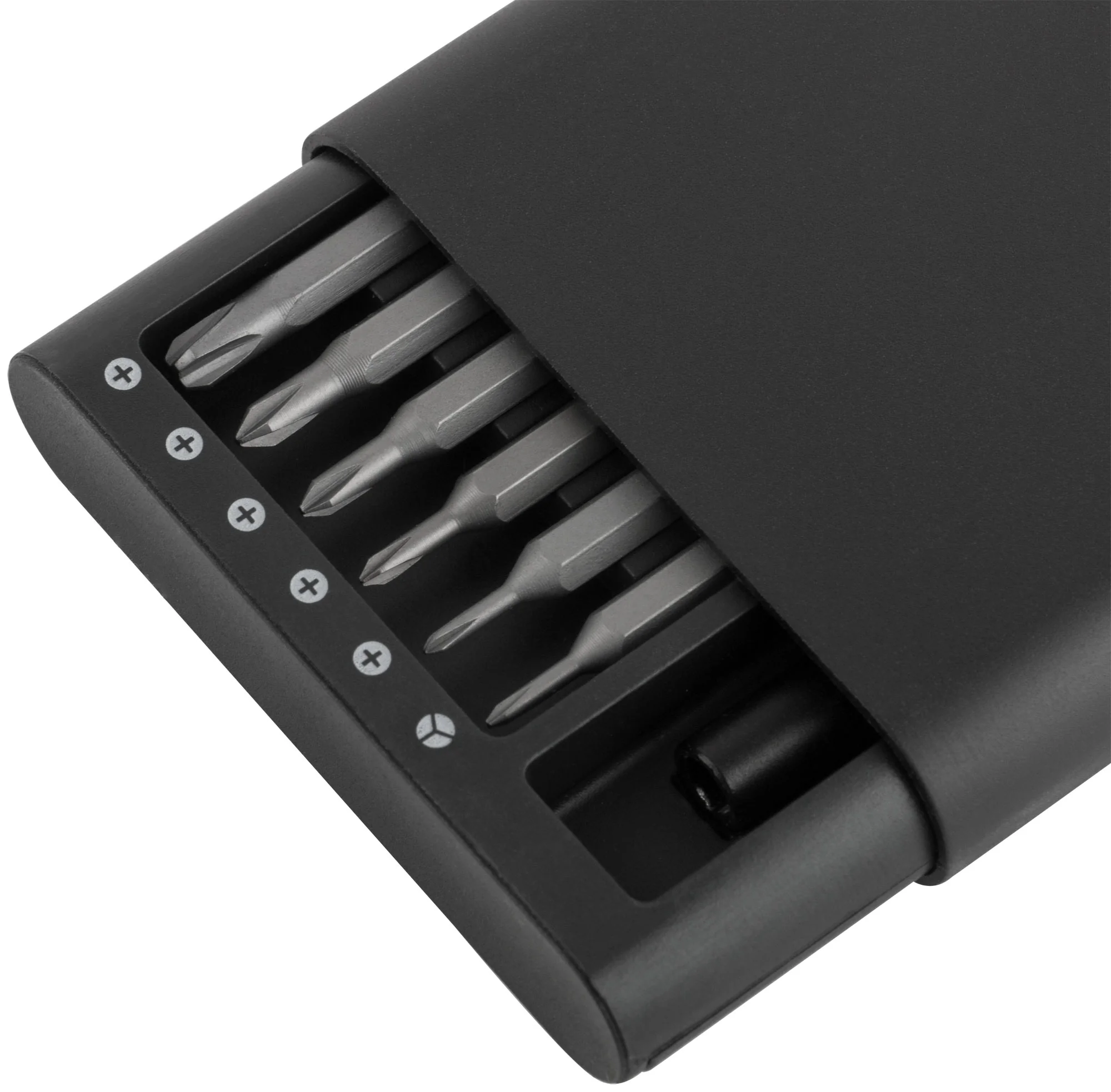 Набор включает 24 биты из термообработанной стали S2, что обеспечивает высокую износостойкость и долговечность. Все компоненты удобно размещены в обтекаемом алюминиевом кейсе с магнитными пазами, которые удерживают биты на месте.