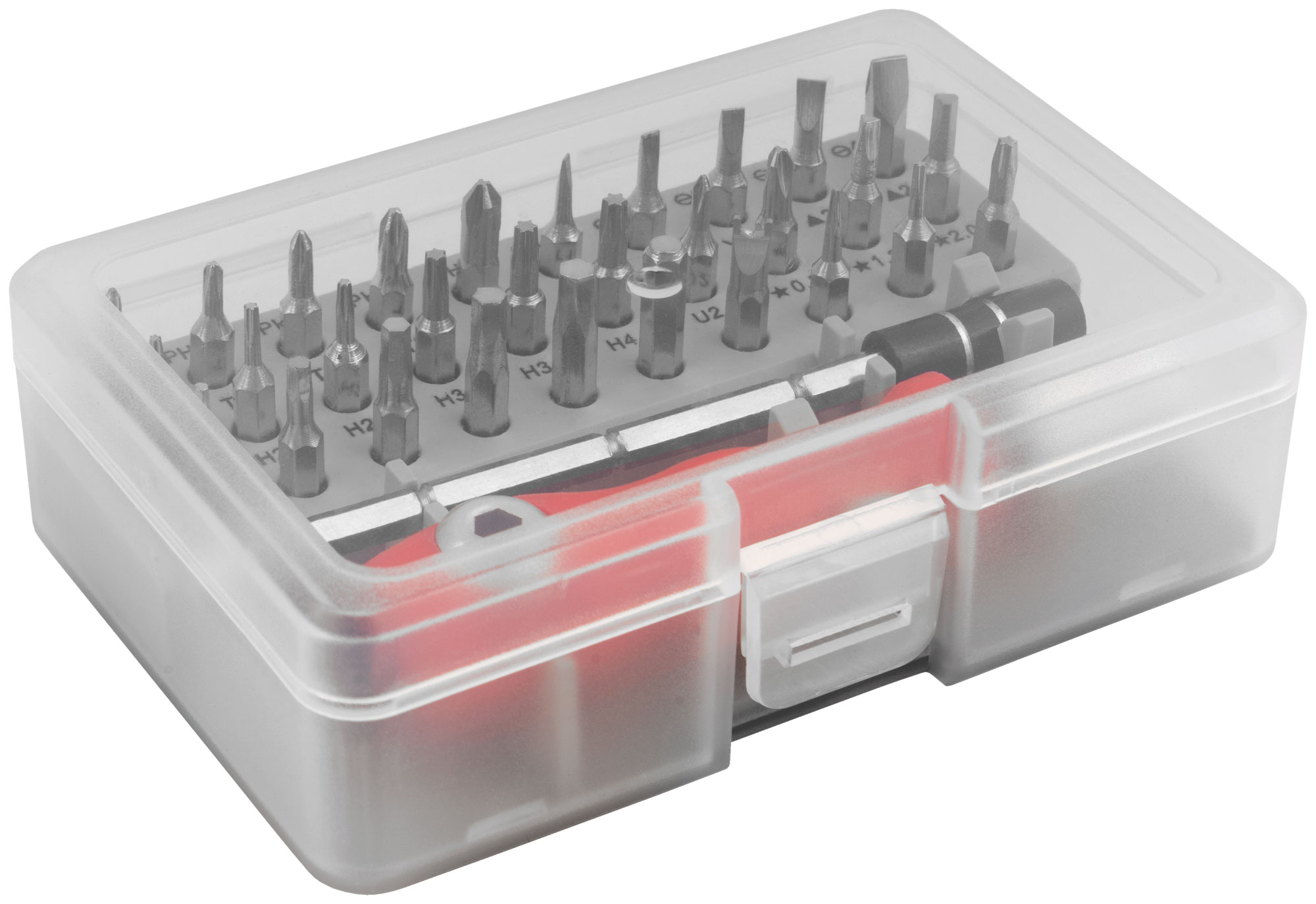 Пластиковый бокс сохраняет компактность набора, предотвращая потерю бит, а его прочная конструкция защищает содержимое от повреждений.