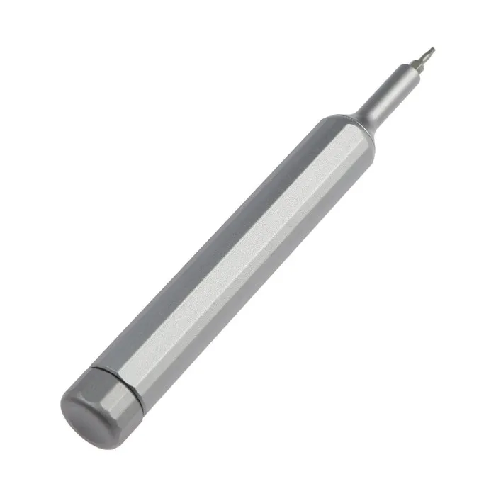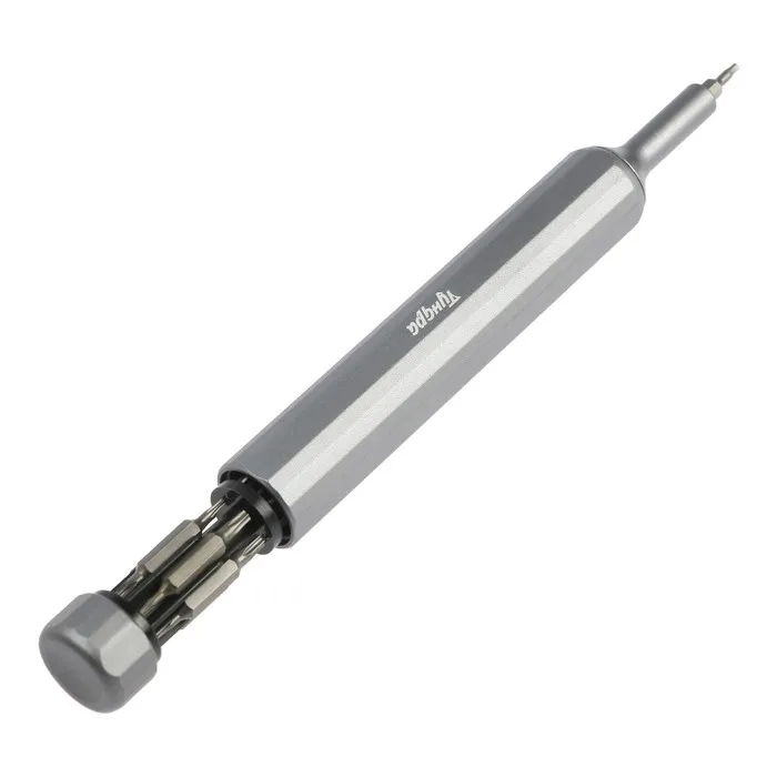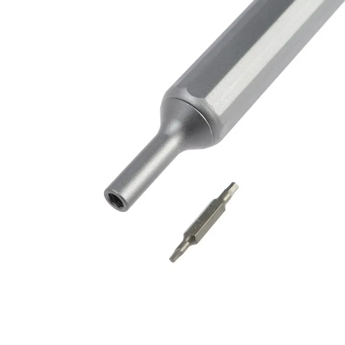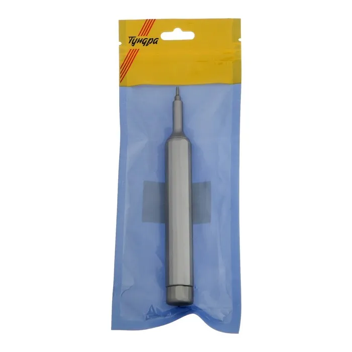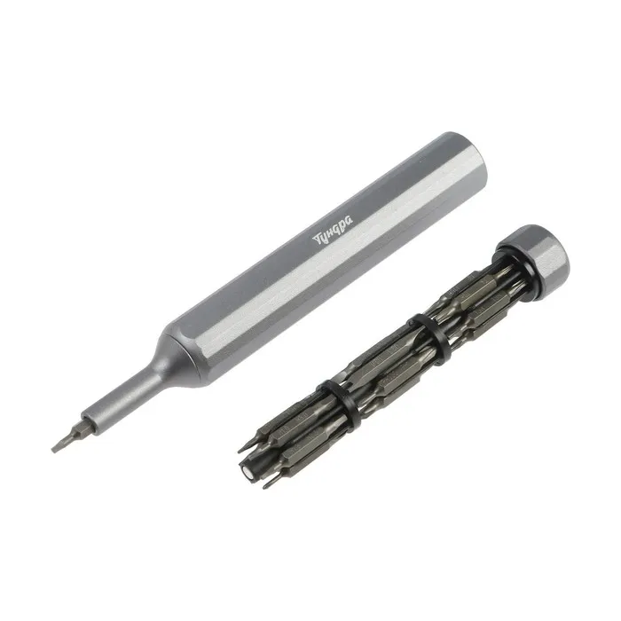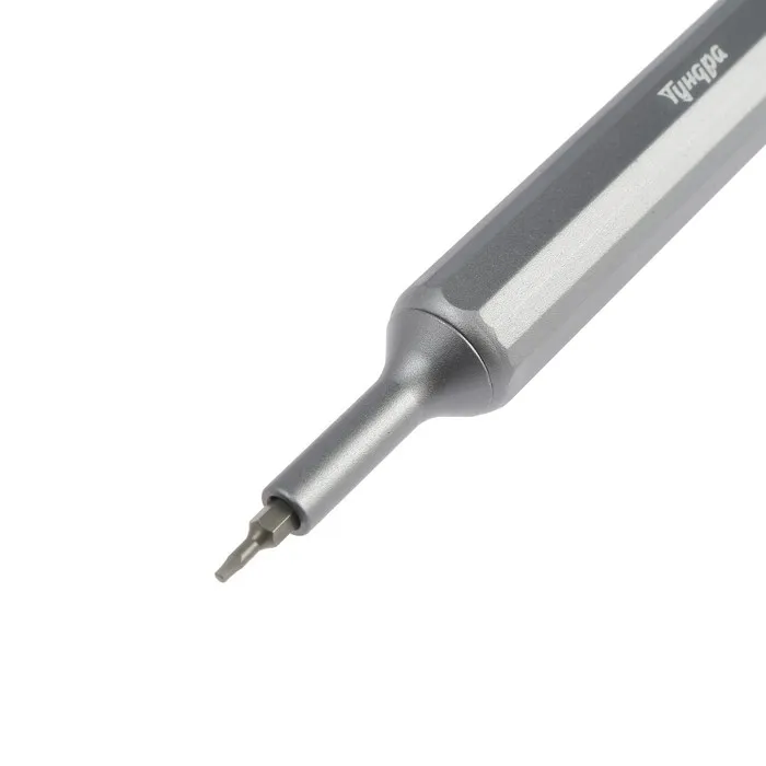 Отвёртка для точных работ «ТУНДРА» оснащена держателем для бит. Он вставляется внутрь самой отвёртки и крепится за счёт магнита. Второй магнит расположен в рабочей части отвёртки, в отверстии, куда вставляется выбранная насадка.