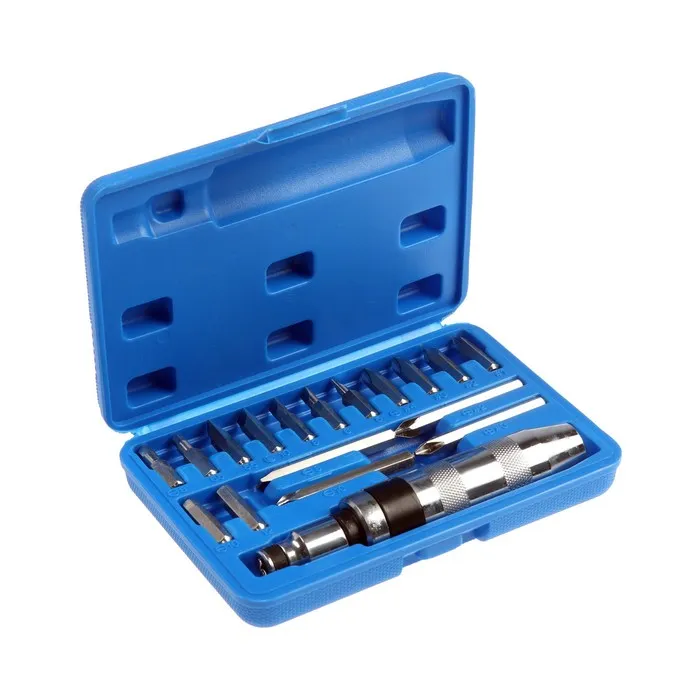 В комплекте с отвёрткой идут биты в количестве шести штук. Инструменты хранятся в специальном кейсе, что упрощает их хранение и транспортировку.
