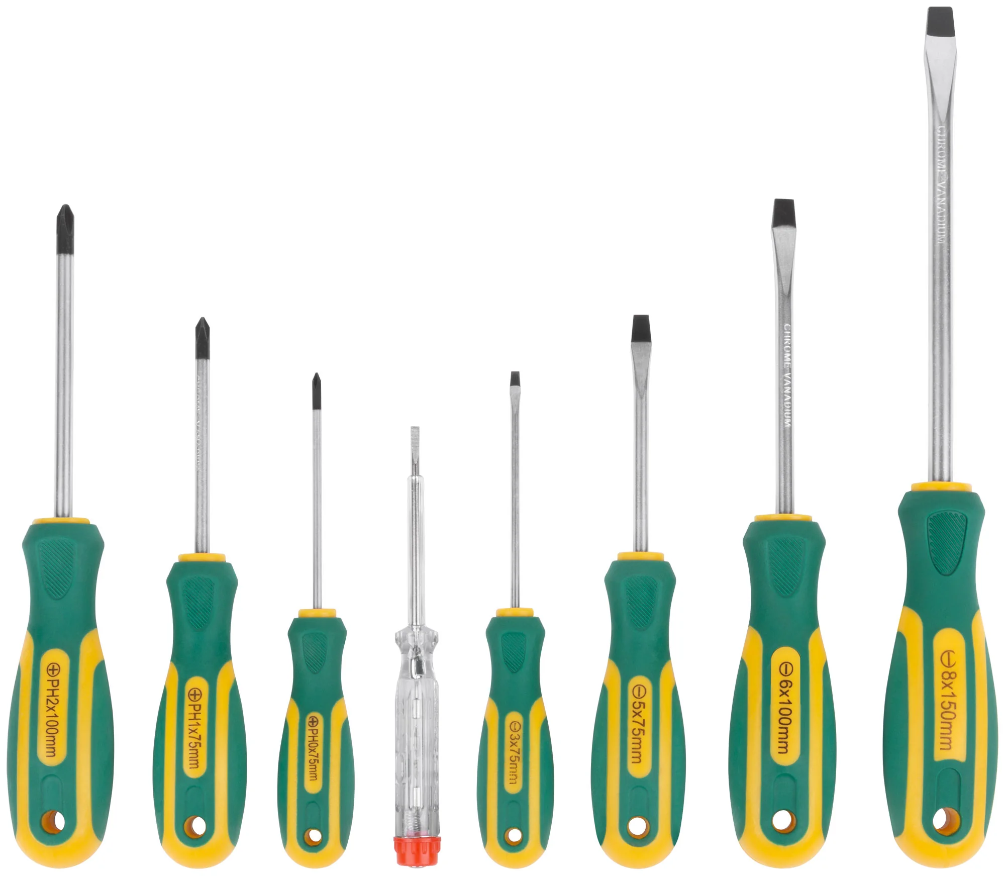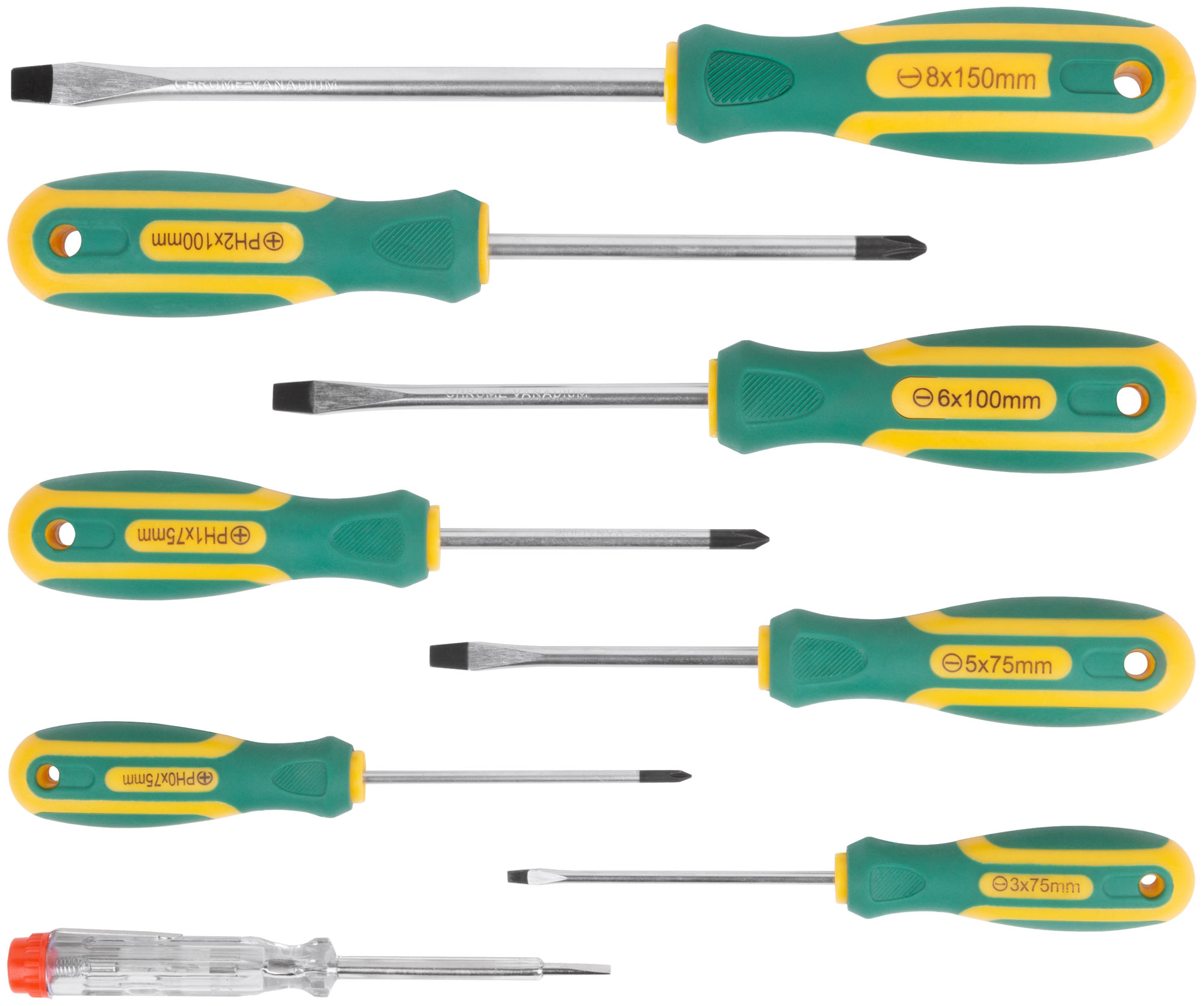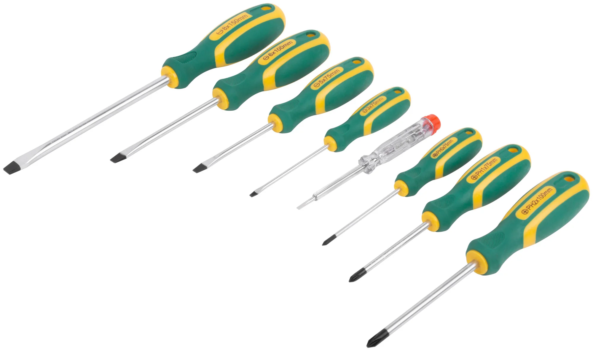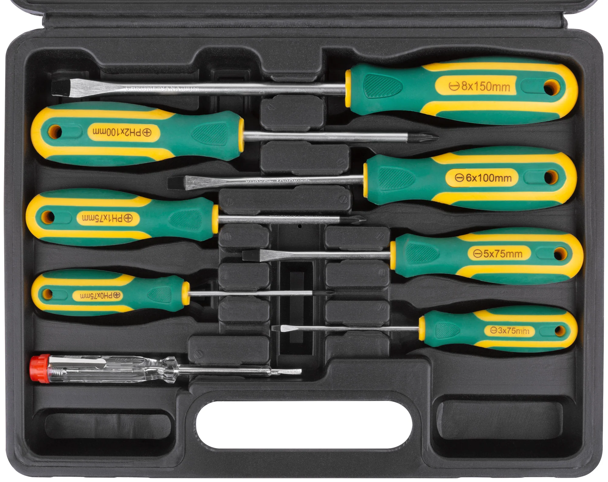 Идеально подходит для выполнения различных задач по монтажу и ремонту. Незаменим в арсенале профессиональных мастеров и домашних умельцев. Набор включает в себя все необходимые отвертки для работы с крепежом разных типов.