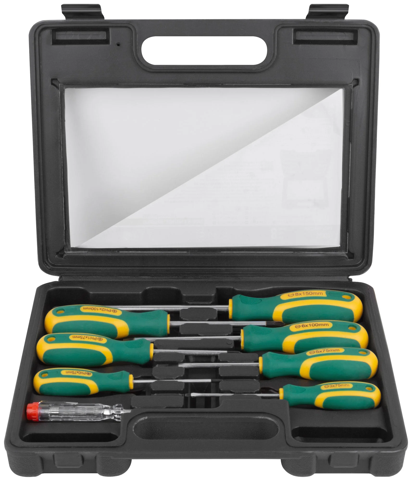 Отвертки изготовлены из хром-ванадиевой стали, что обеспечивает их прочность и долговечность. Прорезиненные ручки обеспечивают надежный хват, что предотвращает скольжение и обеспечивает комфорт даже при длительной работе. Пластиковый кейс позволяет удобно хранить и транспортировать набор.