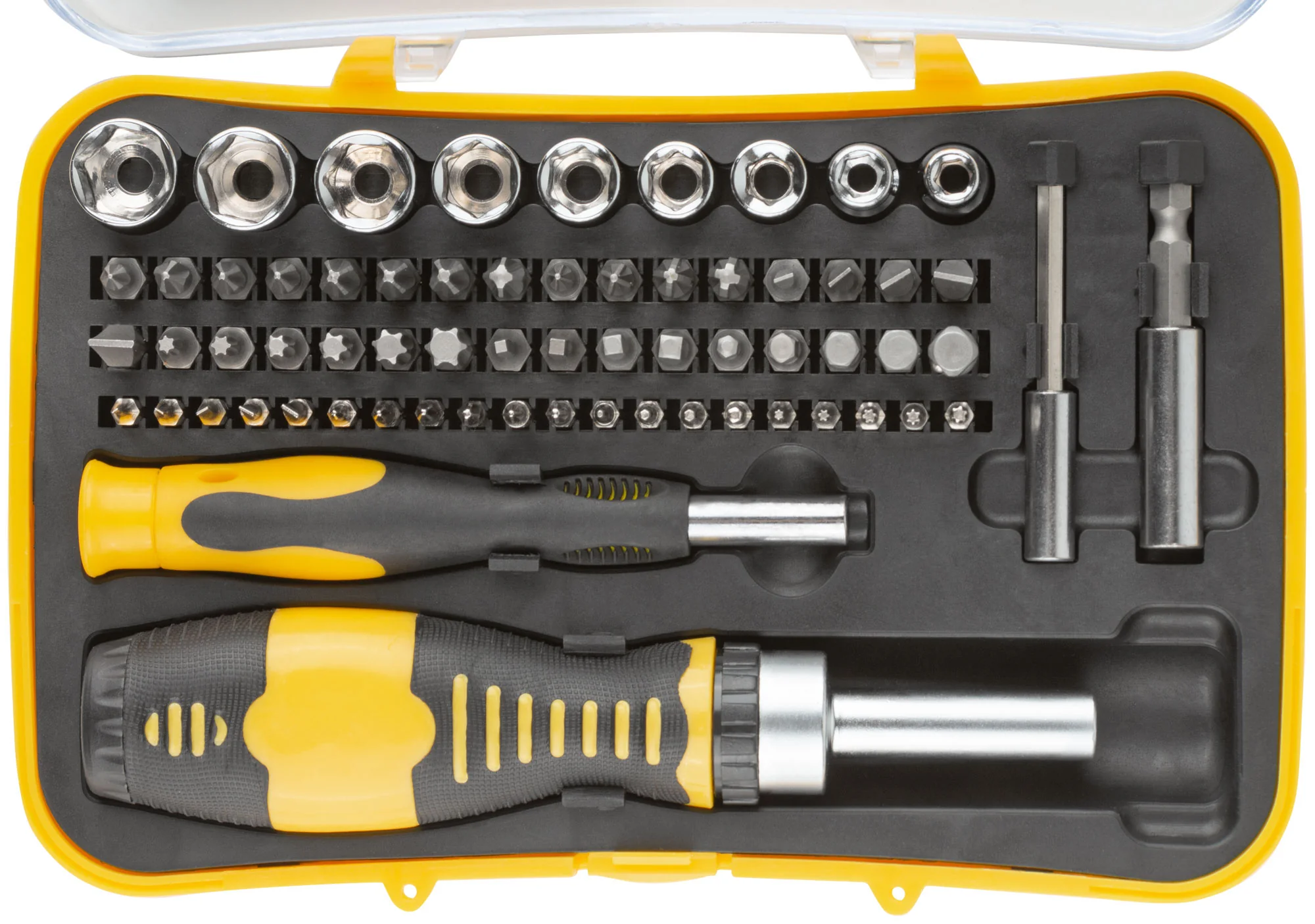 Этот набор идеально подходит для профессионалов и домашних мастеров, которым необходимо надежное и удобное решение для разнообразных задач. Набор включает 65 инструментов, которые помогут справиться с большинством ремонтных и сборочных работ.