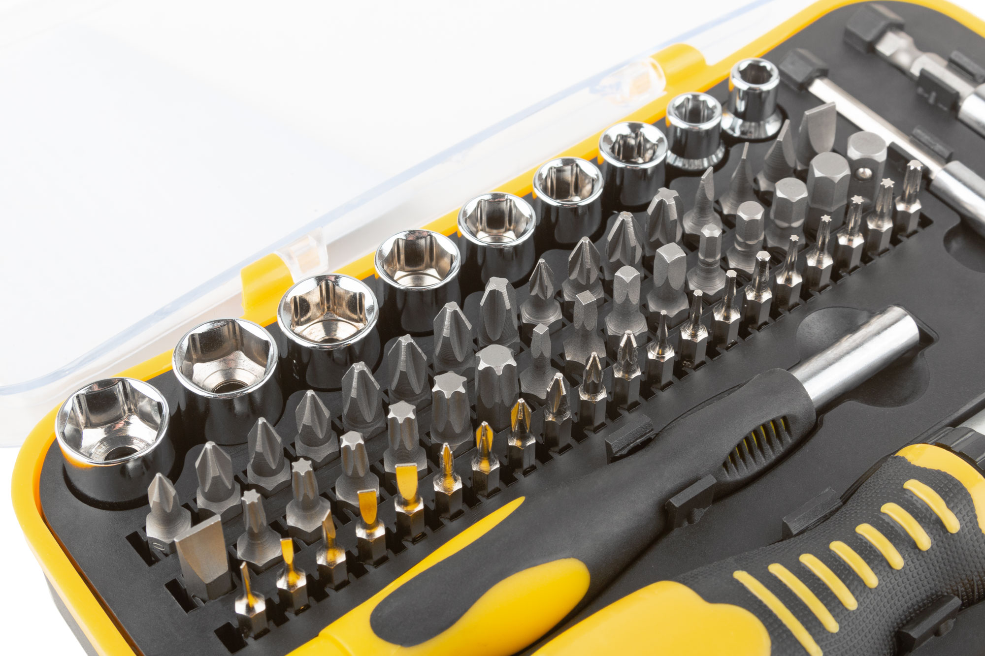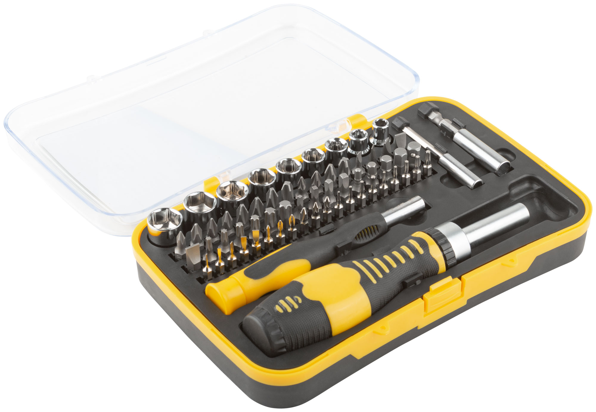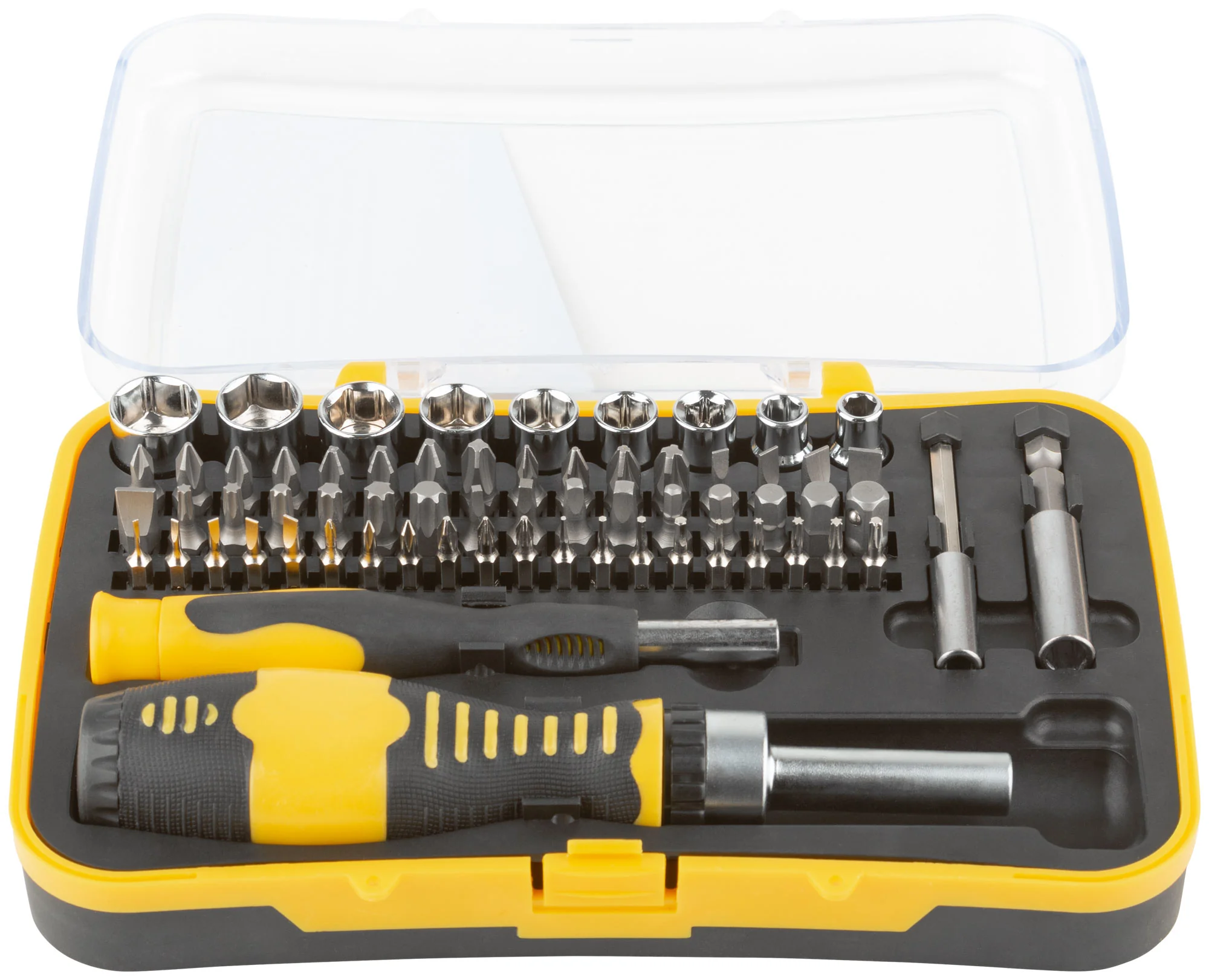 В комплект входят 31 бит с магнитным наконечником, 20 бит для точных работ, 9 головок, переходник, 2 магнитных адаптера, реверсивная отвертка, отвертка для точных работ.