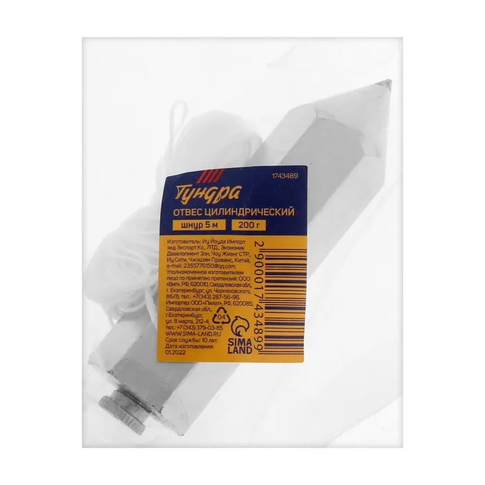 Отвес цилиндрический ТУНДРА, шнур 5 метров, 200 г — Характеристики