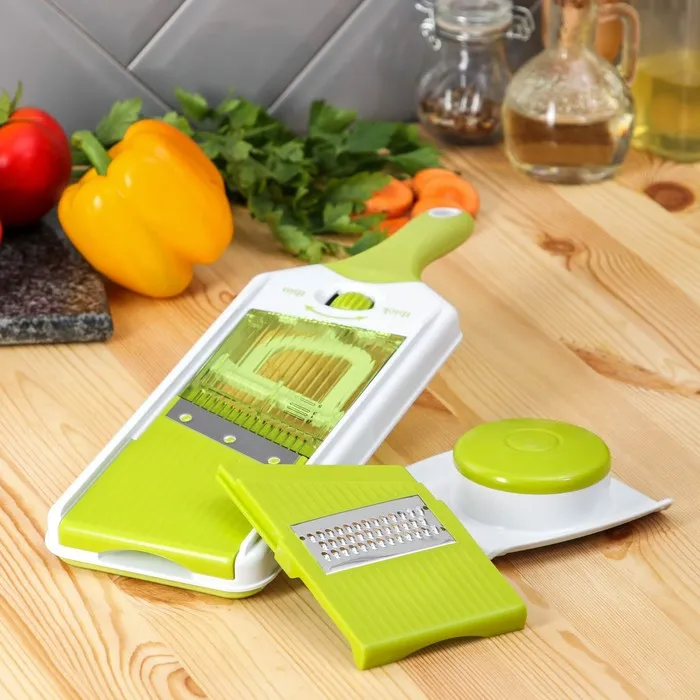 - Высокое качество материалов: прочный пластик и металл гарантируют долговечность и устойчивость к износу. Овощерезка прослужит вам долгие годы.