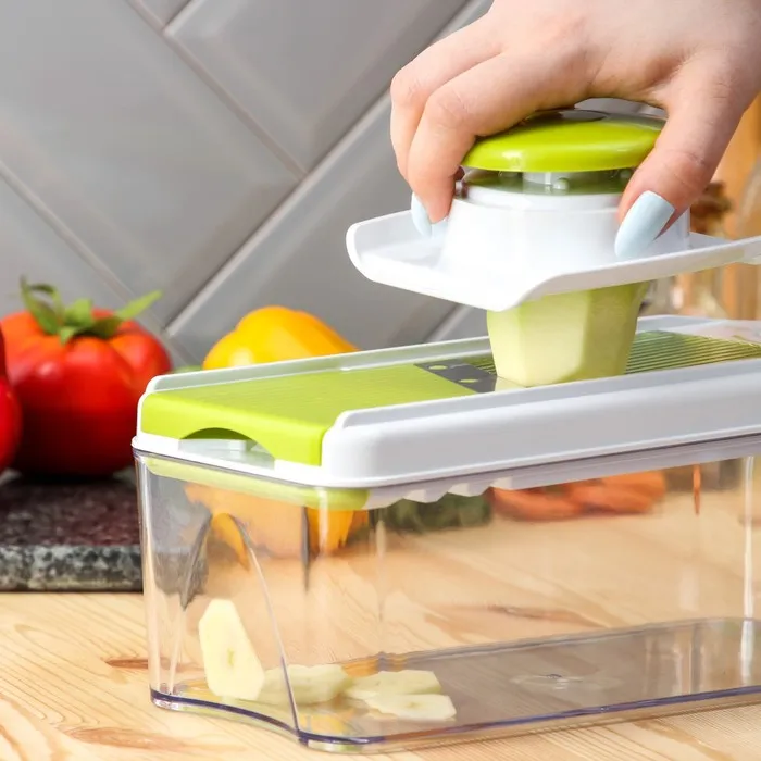 - Вместительный контейнер: нарезайте сразу большое количество овощей и фруктов, используя удобный контейнер. Забудьте о необходимости прерывать работу для перекладывания продуктов.