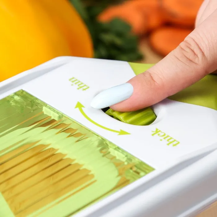 - Выберите необходимую толщину кружков или соломки с помощью регулятора, поворачивая по часовой стрелке для более тонкого среза; поворачивая против часовой стрелки для более толстого среза.