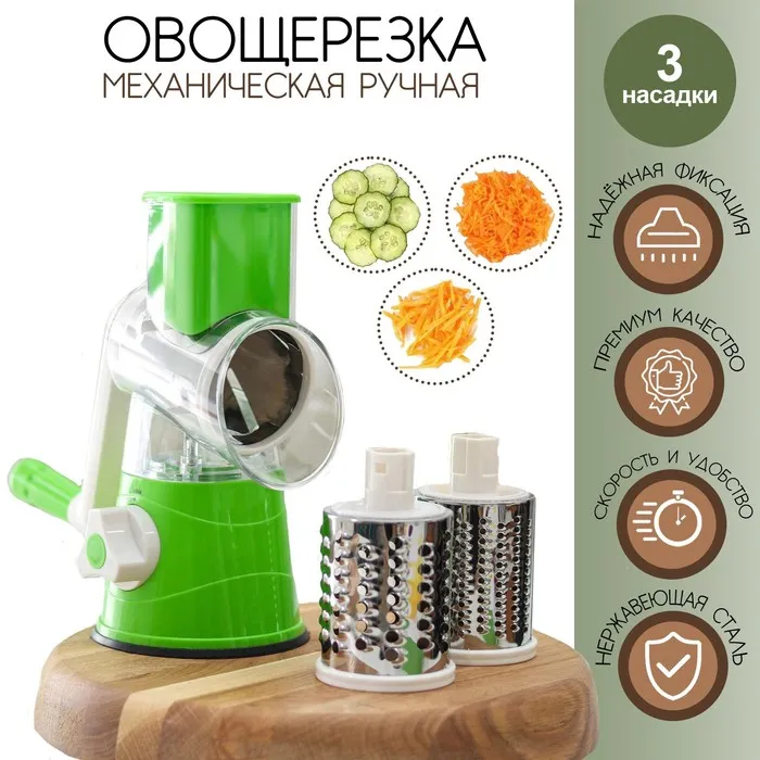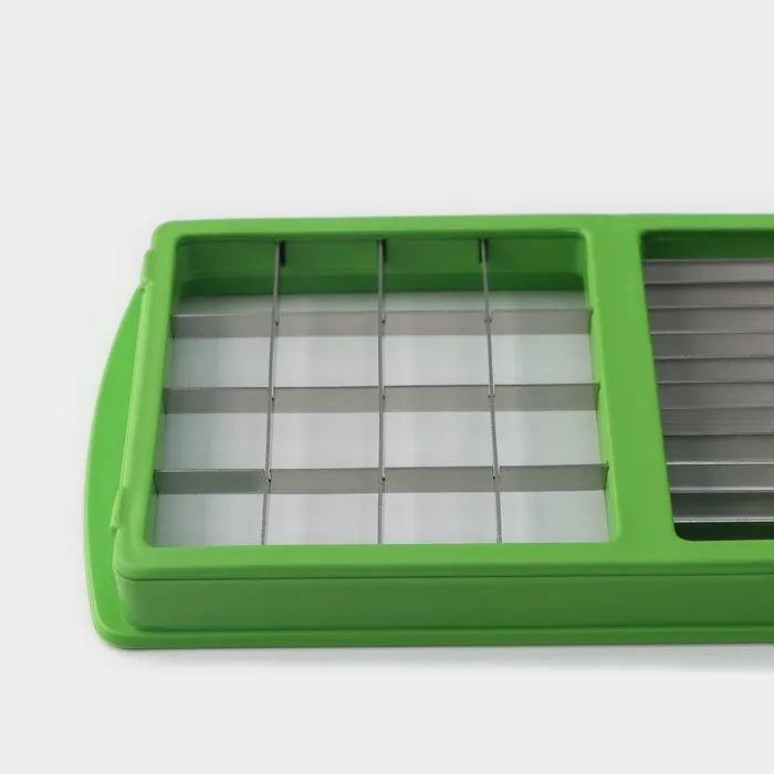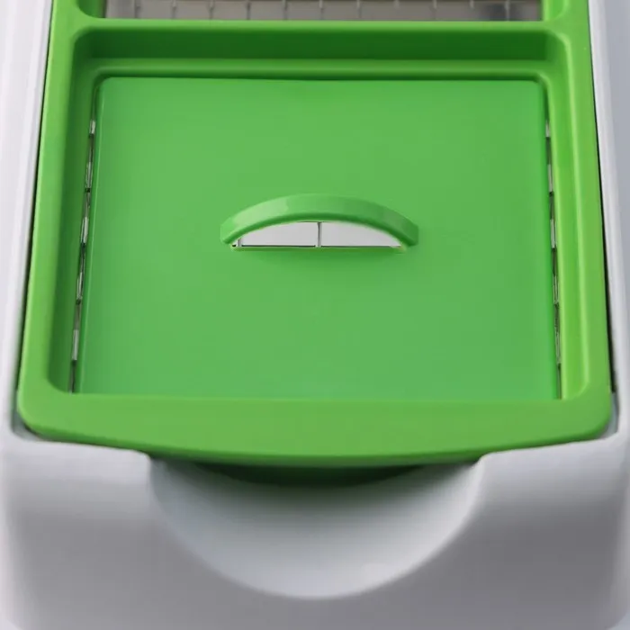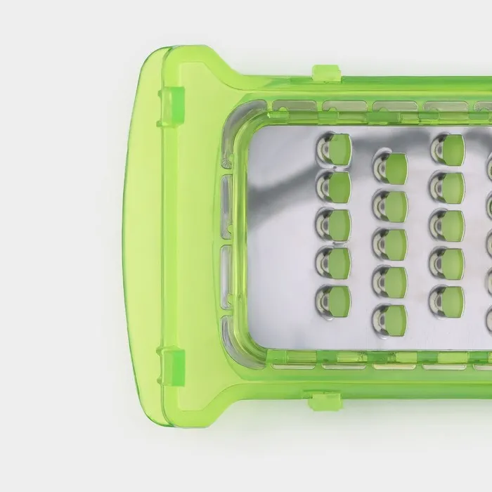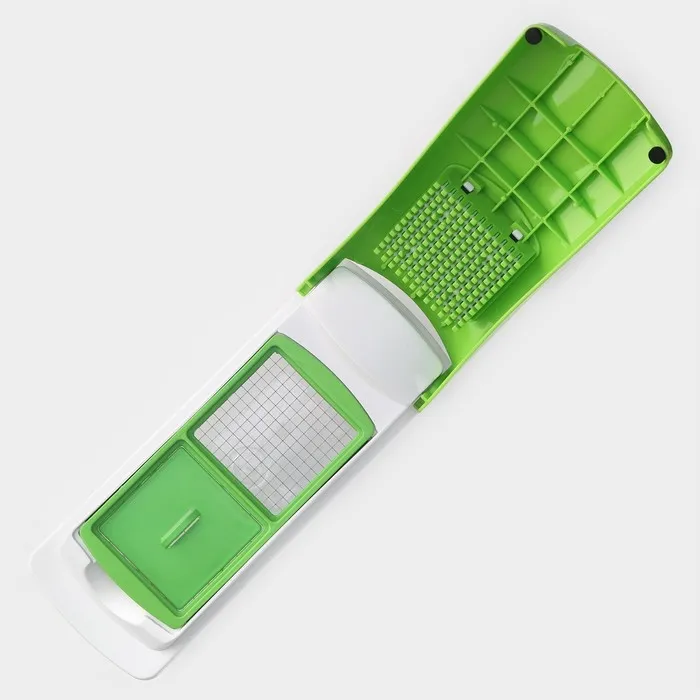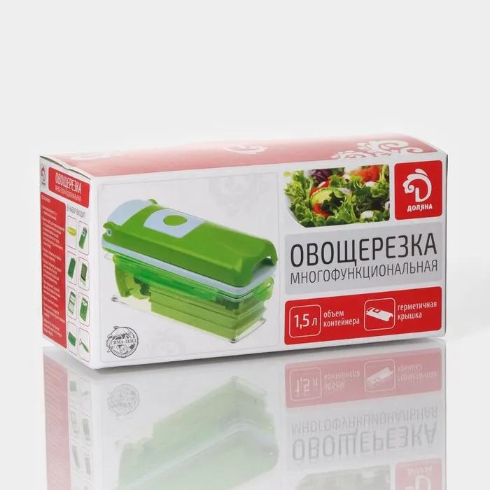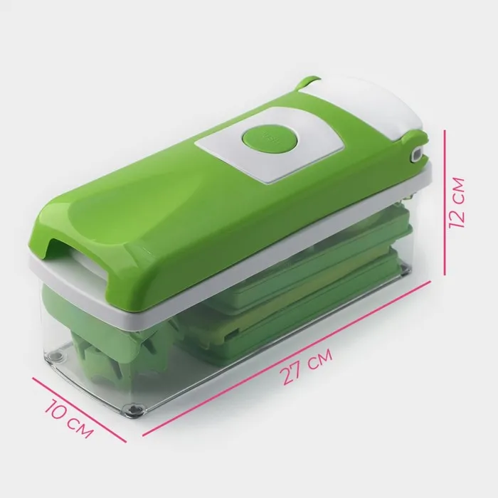 Экономьте свои время и силы: специальные лезвия помогут быстро накрошить салат из овощей, фрукты для торта и многое другое. Овощерезка универсальная Доляна «Фреш Флеш», 7 насадок, овощечитска, мерный контейнер, 27×10×12 см, зелёная, белая быстро и безопасно мыть. Благодаря особой конструкции частички пищи не застревают и спокойно вымываются струёй тёплой воды.