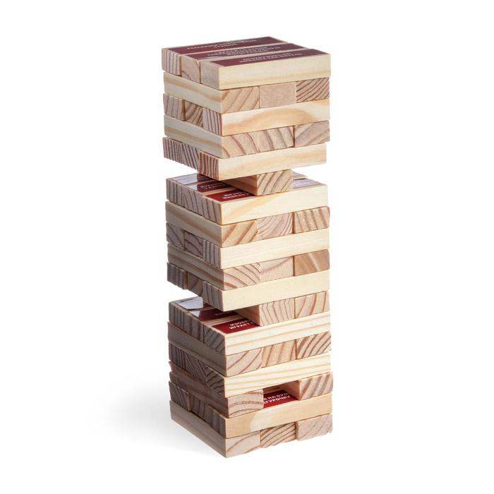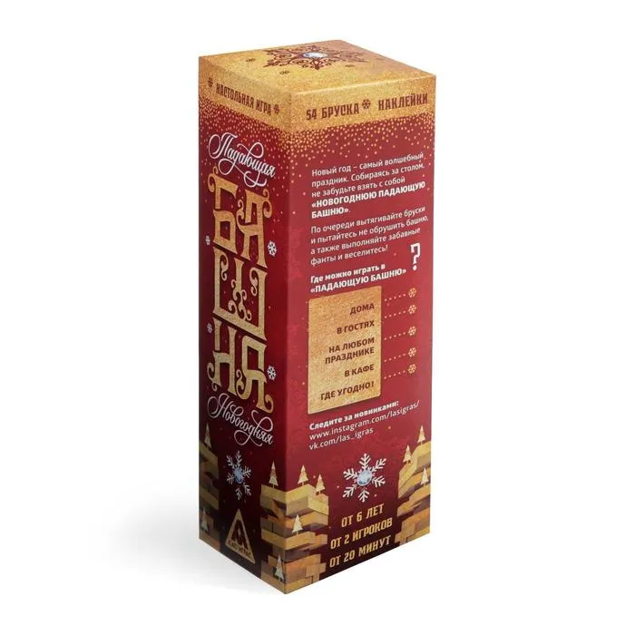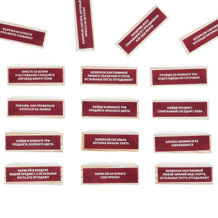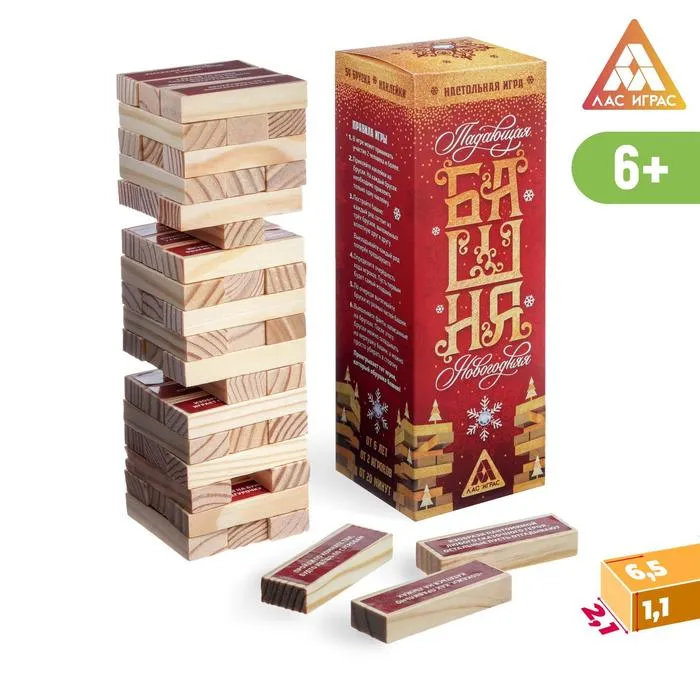 Собираясь всей семьёй 31 декабря, не забудьте взять «Новогоднюю» падающую башню. По очереди вытягивайте бруски и пытайтесь не обрушить конструкцию. А ещё выполняйте забавные праздничные фанты!
