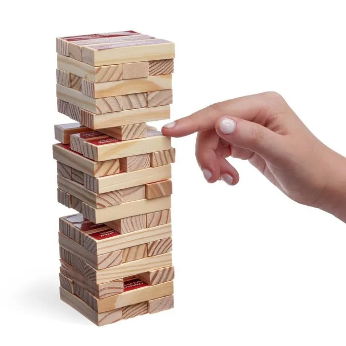 Для начала приклейте наклейки на брусочки. А дальше принцип игры прост: сложите дощечки друг на друга, каждый следующий ряд перпендикулярно предыдущему. Поочередно тяните из башни по одному бруску так, чтобы конструкция не сломалась, и выполняйте фант!