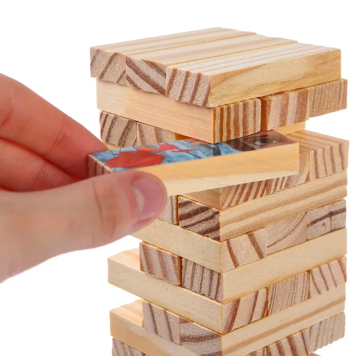 Постройте башню из брусков и-и-и… вытягивайте по одной штучке из башни так, чтобы последняя не упала. На каждом элементе вы найдёте слова и приклеенные вами картинки. Именно они подскажут, какими способами нужно объяснять слова с брусков.
