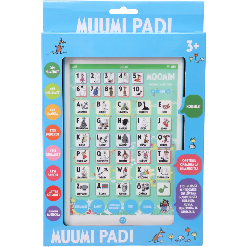Подушка с мотивами Муми предлагает детям веселый способ изучения букв и цифр в мире Муми. Подушка на финском языке. В комплект входят батарейки (3 x AAA).