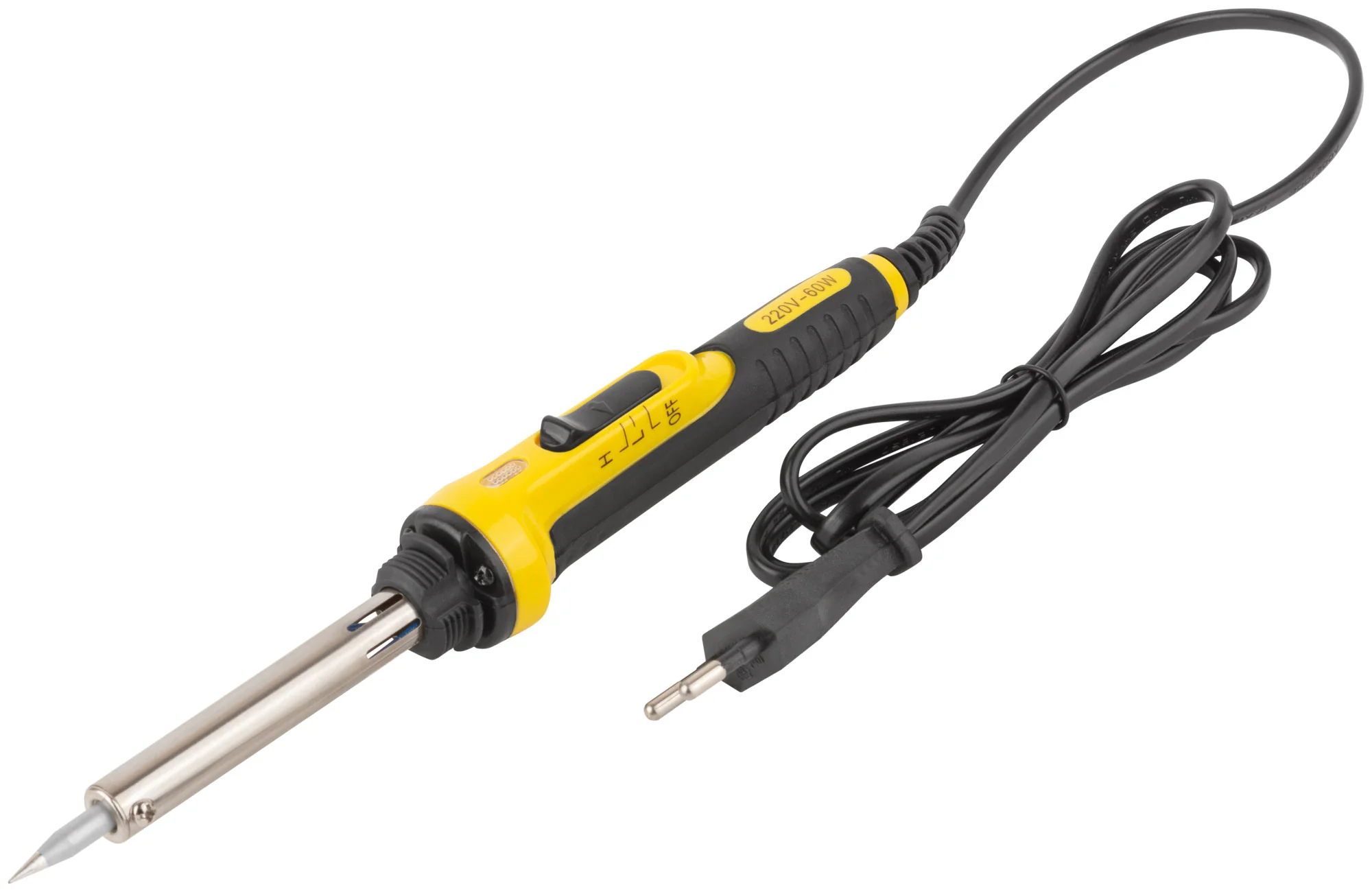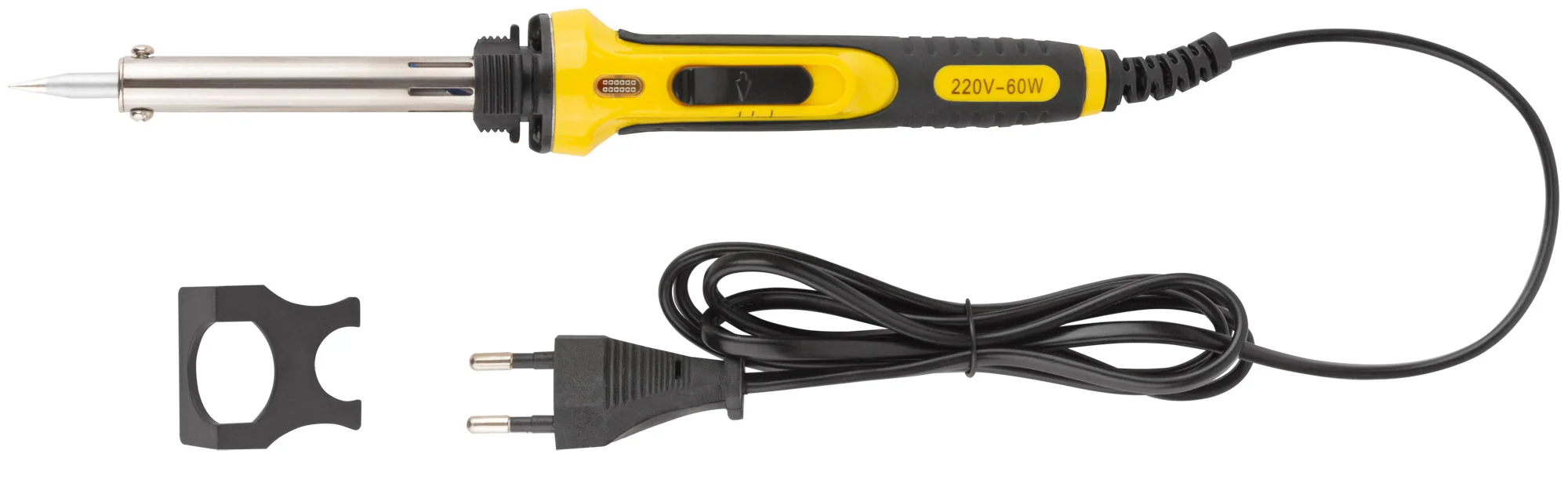 Инструмент оснащен конусным медным жалом с покрытием из ферросплава, что обеспечивает долгий срок службы и высокую эффективность. Паяльник также имеет световой индикатор, который помогает контролировать выбранный режим: зелёный свет для 30 Вт и красный для 60 Вт. Прорезиненная ручка обеспечивает комфортное удержание, минимизируя скольжение и усталость во время работы. Также в комплект входит подставка из термостойкого нейлона для безопасного хранения паяльника в периоды отдыха.
