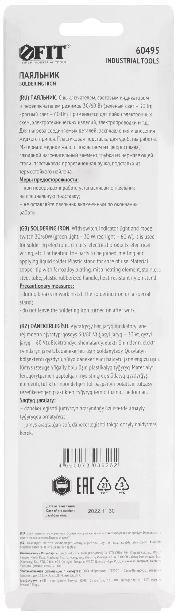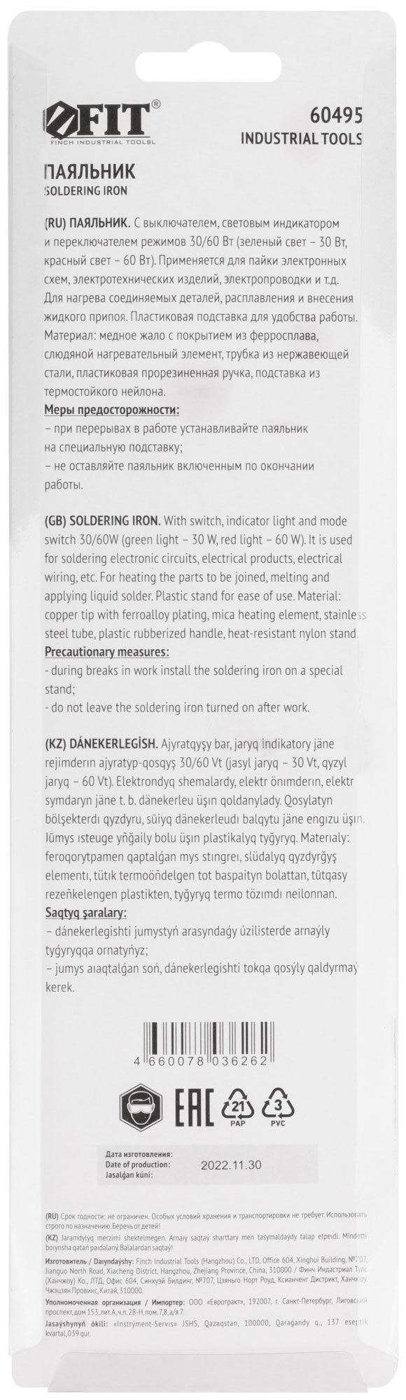 Паяльник FIT 60495 — это незаменимый инструмент для выполнения электротехнических работ. Он позволяет проводить пайку на различных уровнях мощности: 30 Вт для деликатной работы и 60 Вт для более интенсивных задач. Благодаря встроенному переключателю режимов, вы легко можете адаптировать инструмент под текущие нужды.