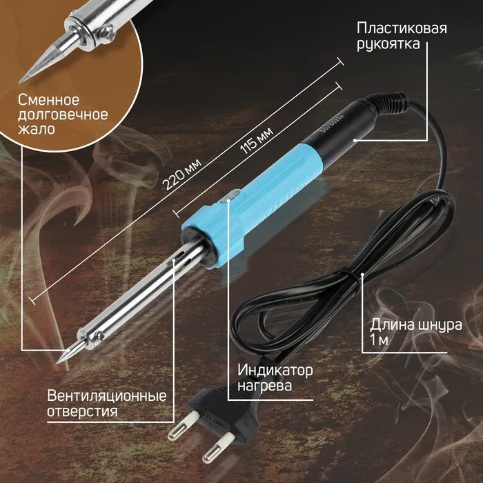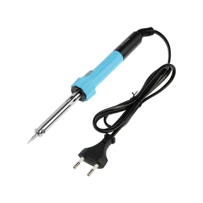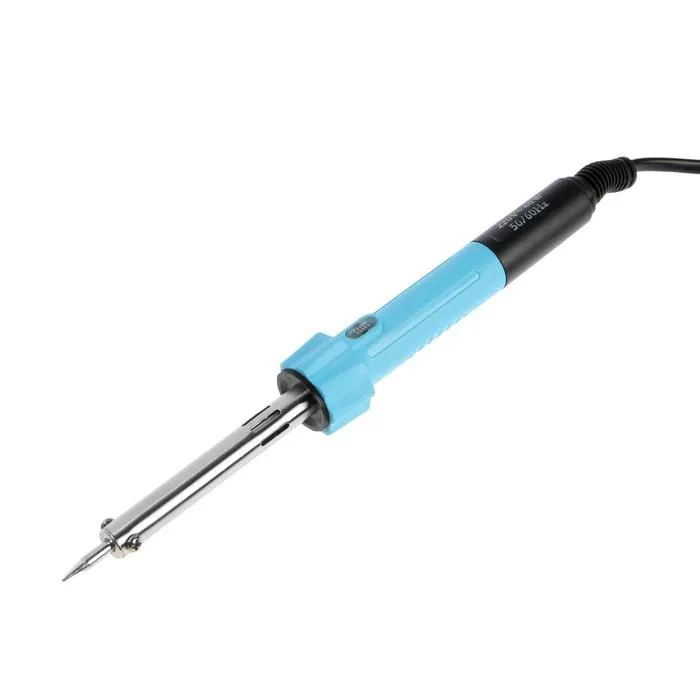 С помощью светового индикатора, встроенного в инструмент можно с лёгкостью определить нагрев инструмента. Паяльник питается от сети в 220 В. и имеет мощность в 40 Вт, благодаря чему происходит быстрый нагрев жала. Специальный изоляционный слой предотвращает случайный контакт с токоведущей частью во время работы с инструментом.