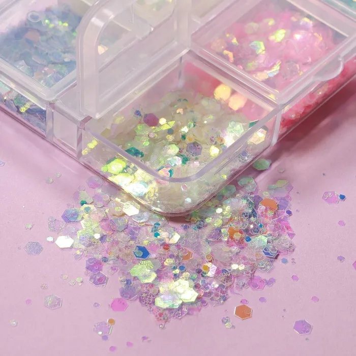 Чтобы сделать его ещё привлекательнее и ярче - Вам помогут разноцветные пайетки, которые светятся в темноте. Просты в использовании и универсальны в применении. Можно использовать не только для маникюра, но и для поделок, декора. Пайетки находятся в органайзере, что не позволит им высыпаться.