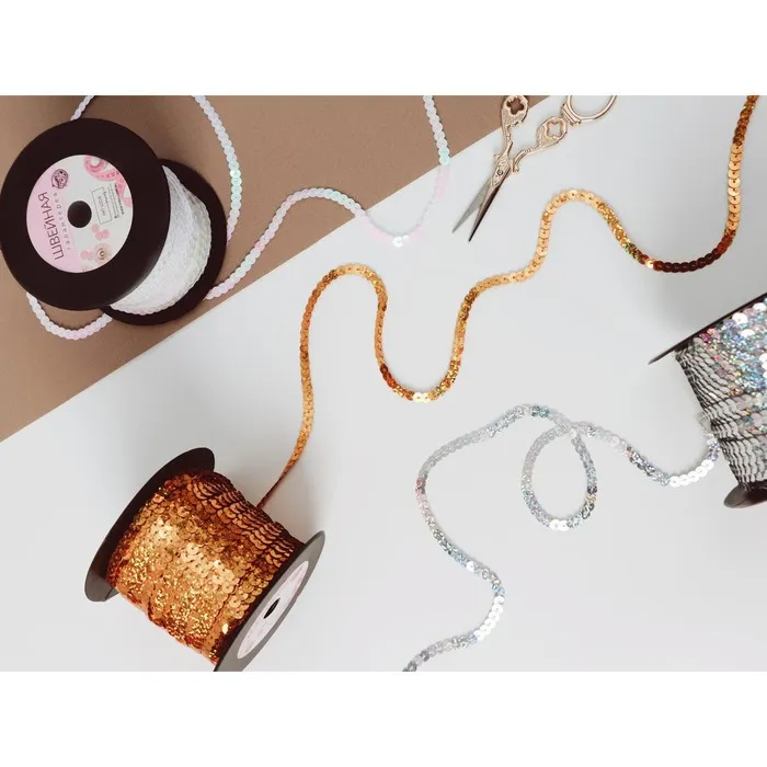 Используйте ленту с пайетками для изготовления карнавального костюма или праздничного наряда. Она пригодится в скрапбукинге и при оформлении подарка. Пришейте или приклейте универсальную декоративную ленту: не нужно закреплять каждую блестяшку отдельно! Тесьма мягко ляжет в фигурные складки и станет изюминкой наряда.