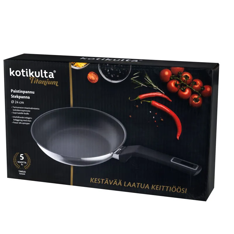 Сковорода Kotikulta из серии Titanium подходит для всех типов плит, включая индукционные. Алюминиевая конструкция оснащена легкоочищающимся трехслойным антипригарным покрытием. Эргономичная бакелитовая ручка обеспечивает надежный захват.