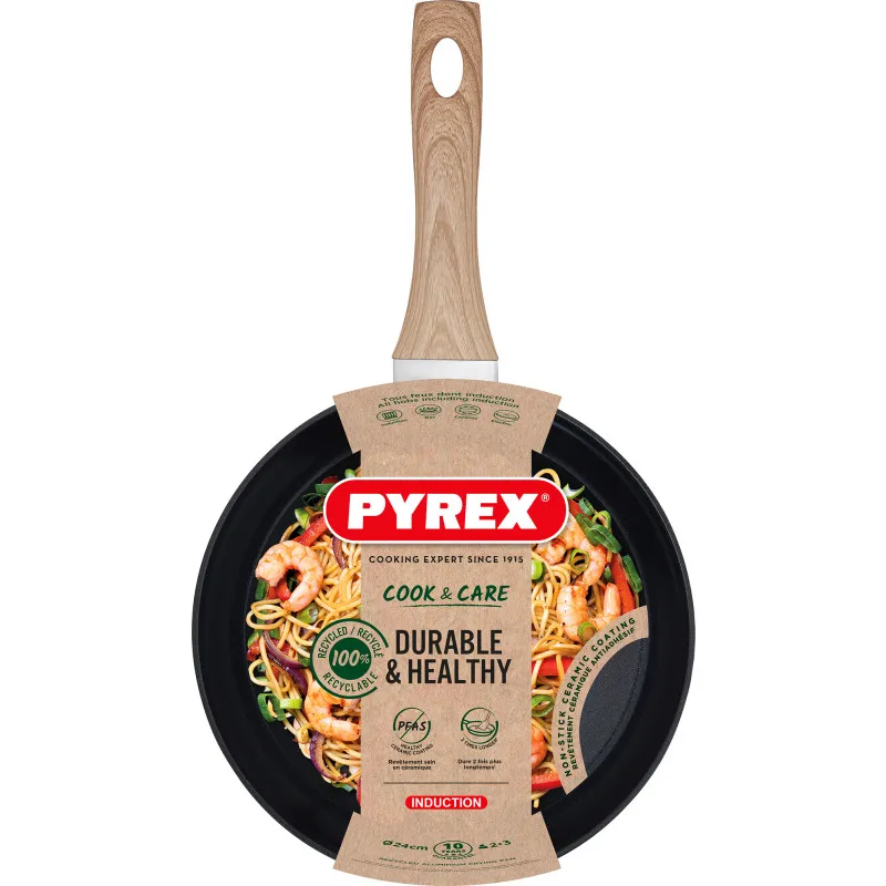 Pyrex Cook & Care - это надежный и стильный выбор для повседневного использования на кухне. Сковорода изготовлена из 100% переработанного и перерабатываемого алюминия, имеет особо прочное керамическое антипригарное покрытие и удобную, красивую ручку. Индукционное дно обеспечивает оптимальное распределение тепла.