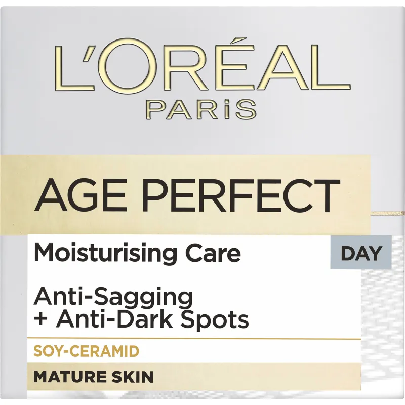 L'Oréal Age Perfect Moisturising Day Care Anti-sagging + Anti-pigmentation. Дневной крем для зрелой кожи, борющийся с провисанием и пигментацией. После 50 лет, когда уровень естественного эстрогена снижается, кожа может потерять упругость и массу коллагена, что делает её более сухой и вялой, а также могут появляться пигментные пятна. Крем Age Perfect содержит соевый экстракт, пептиды которого стимулируют выработку коллагеновых волокон, важных для структуры кожи. Крем также содержит UV-фильтр и активный ингредиент Melanin-Block(TM), который помогает уменьшить пигментные пятна, вызванные возрастом.