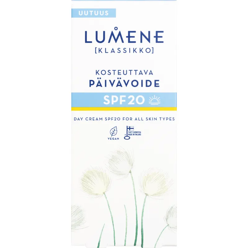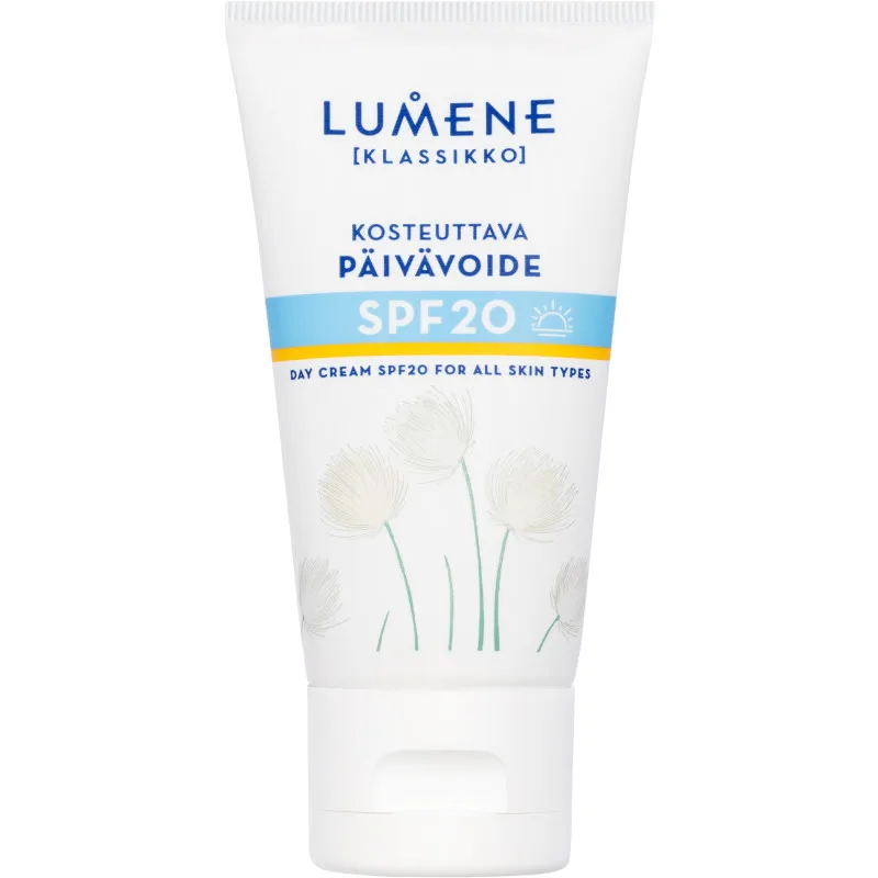 Lumene Klassikko Увлажняющий Дневной Крем SPF20 увлажняет, питает и защищает кожу от UVB/UVA-излучения. Крем делает кожу свежей и красивой. Легкая и быстро впитывающаяся формула содержит увлажняющий северный хлопок и чистую северную родниковую воду. Подходит для всех типов кожи.