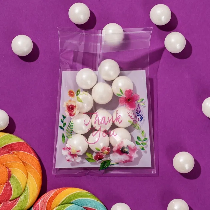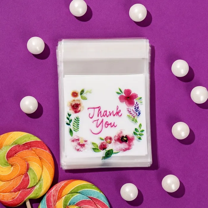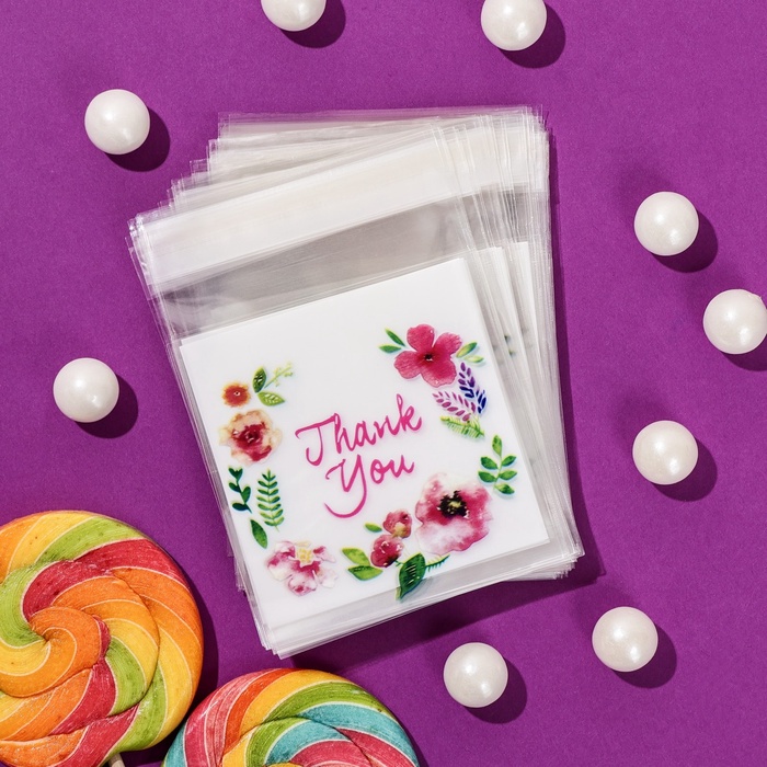 Яркая упаковка со словами благодарности! Набор подарочных пакетов «Спасибо» с клеевым клапаном, 7×7+3 см (100 шт.) — удобное решение для упаковки небольших подарков и сладостей. Прозрачные пакеты с красочными надписями создают праздничное настроение и подходят для любых мероприятий.