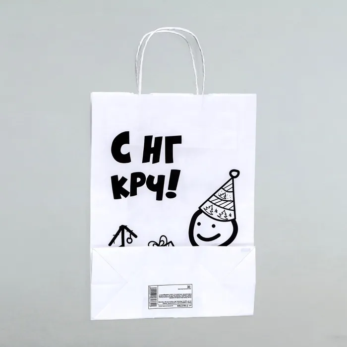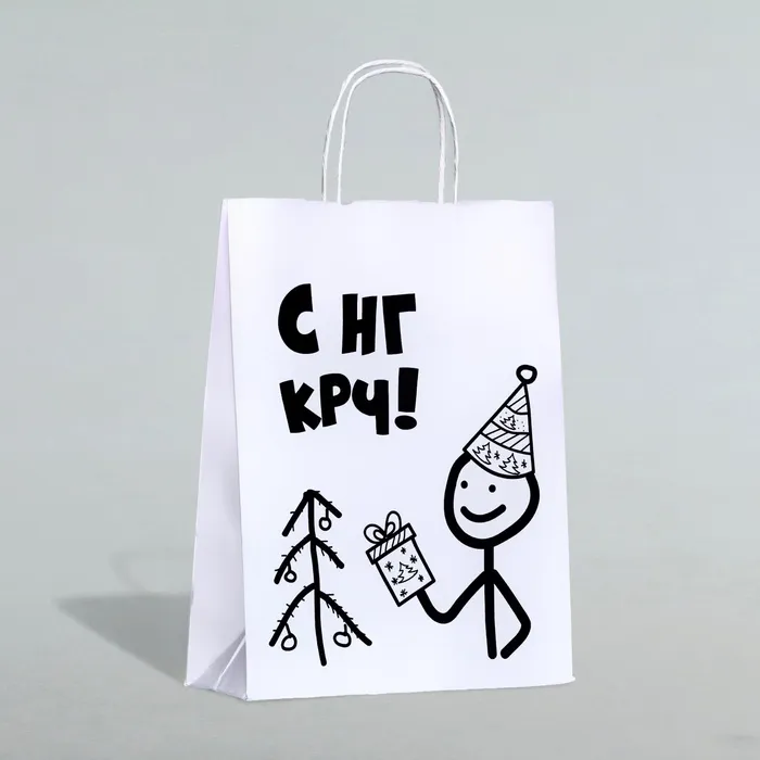 - Яркий современный дизайн: Надпись «С НГ крч!» на белом крафте смотрится свежо и сразу привлекает внимание. Такой пакет легко узнать под елкой — он выделяется на фоне классической упаковки и говорит о неформальном празднике.