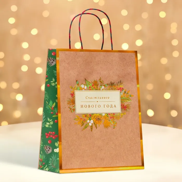 Пакет бумажный подарочный новогодний крафт «Счастливого нового года» 18×22.3×10 см — Характеристики