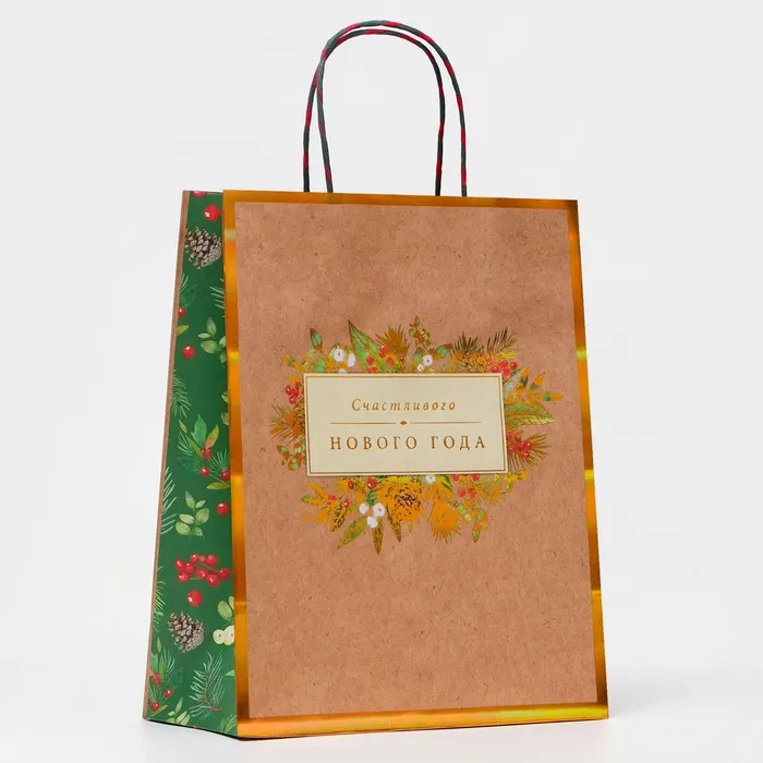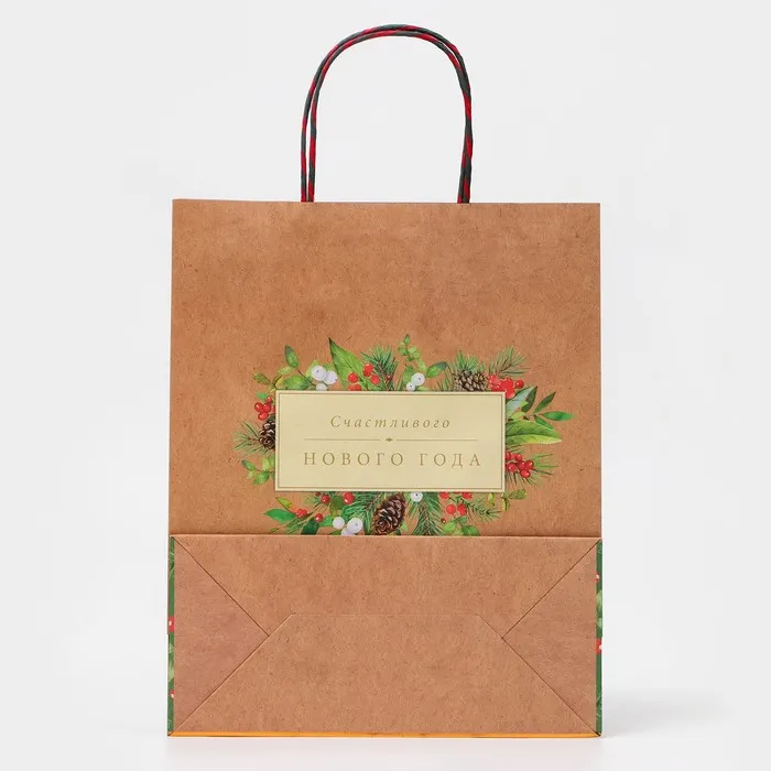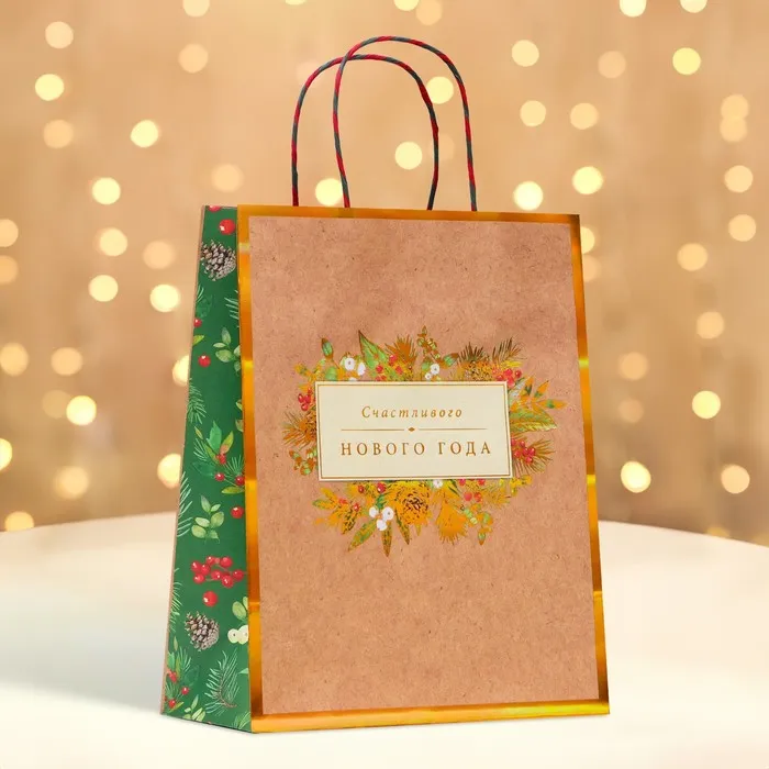 Пакет бумажный подарочный новогодний крафт «Счастливого нового года» 26×32×12 см — Характеристики