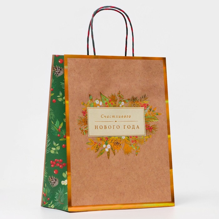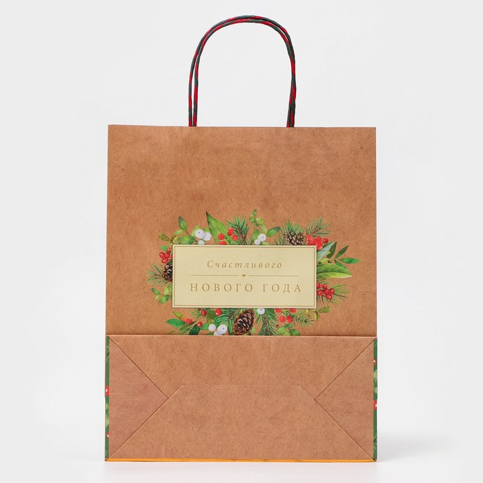 Пакет бумажный подарочный новогодний крафт «Счастливого нового года» 26×32×12 см