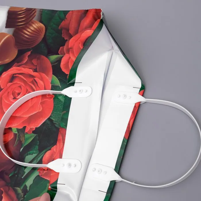 Пакет полиэтиленовый с пластиковой ручкой, благодаря ручкам пакет служит дольше. Прочный и надежный с оригинальным рисунком.