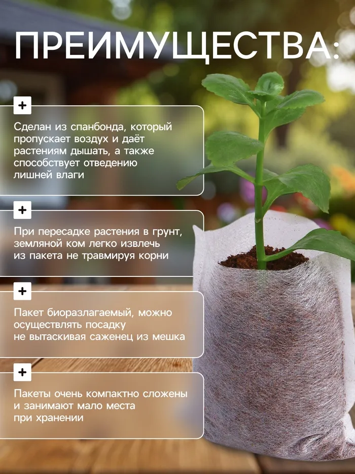 Пакет биоразлагаемый, можно осуществлять посадку не вытаскивая саженец из мешка.
