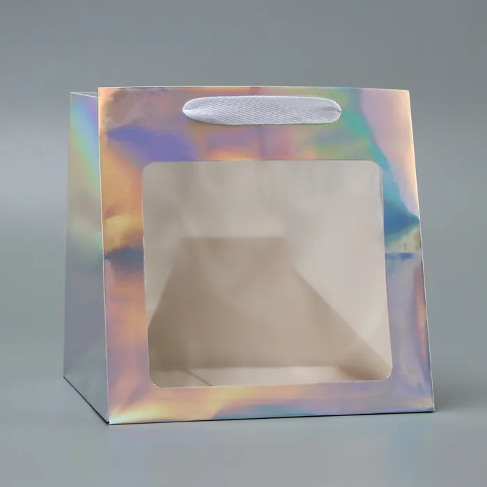 Пакет для торта с квадратным дном и окном, голографический - это стильное и функциональное решение для упаковки и транспортировки тортов.
